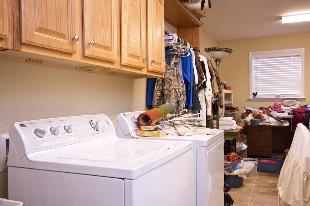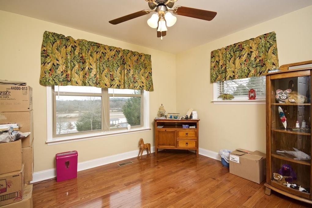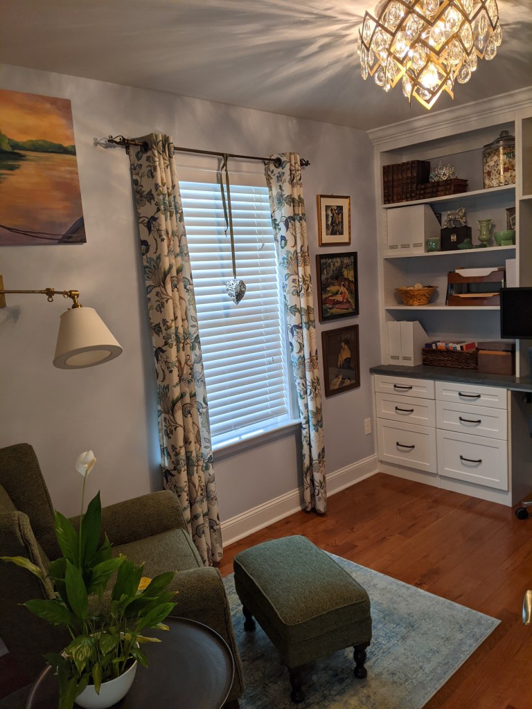 They called this room located in the same hall as the boys’ bedrooms a “hobby” room. Since I have been doing consulting for most of our time at this house, we converted it into an office space for me. It’s the only room where I got to do whatever I wanted to–so lots of stuff on the walls, over the top light fixture, and lots of my favorite color, green. Again, the shelving goes to the ceiling to make the room feel taller.