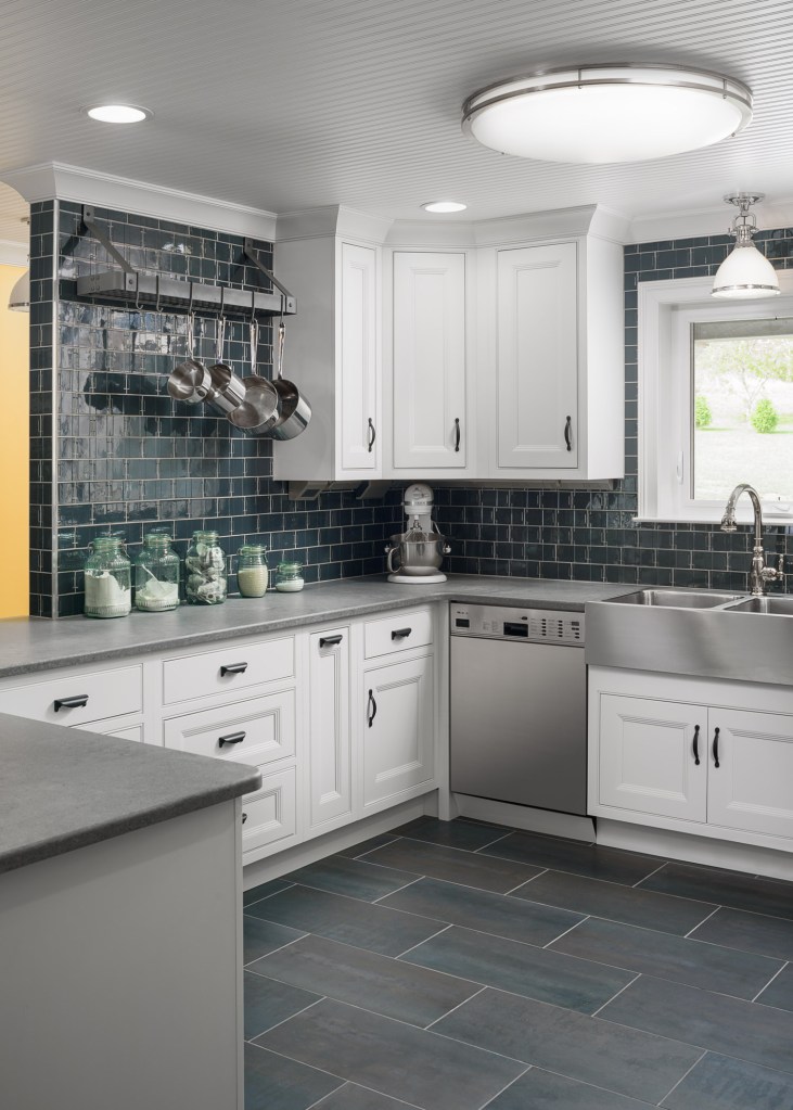 The kitchen is petite–only 12′ x 12′, and the layout when we bought it didn’t work at all–no deep counters for rolling out dough, and everyone had their backs to one another. We fixed all that with the new design. We eliminated part of the wall on the left to open up the entry way, which always felt like a long, narrow hall. We also added a peninsula to provide more work and cabinet space. We replaced the single hung window with an awning casement window and got rid of the valance–many people thought we made the window bigger, but we couldn’t because of the brick exterior. We brought the cabinets up to the ceiling for more storage space which has the added benefit of making the room feel taller. It may surprise you to know that Mike and I picked out everything together and agreed on every detail.