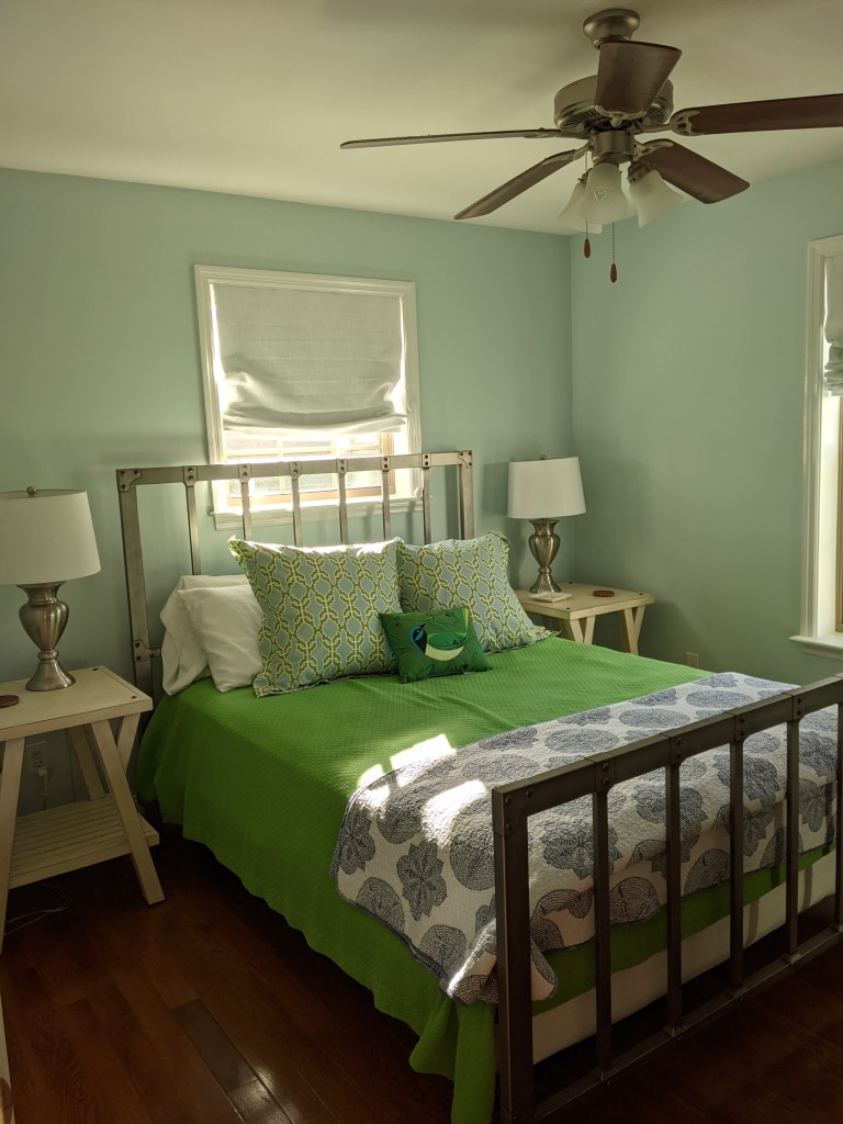 This is Jack’s room. The vivid green of the coverlet makes the walls look greener than they are in real life. They are a beautiful soft blue-green.