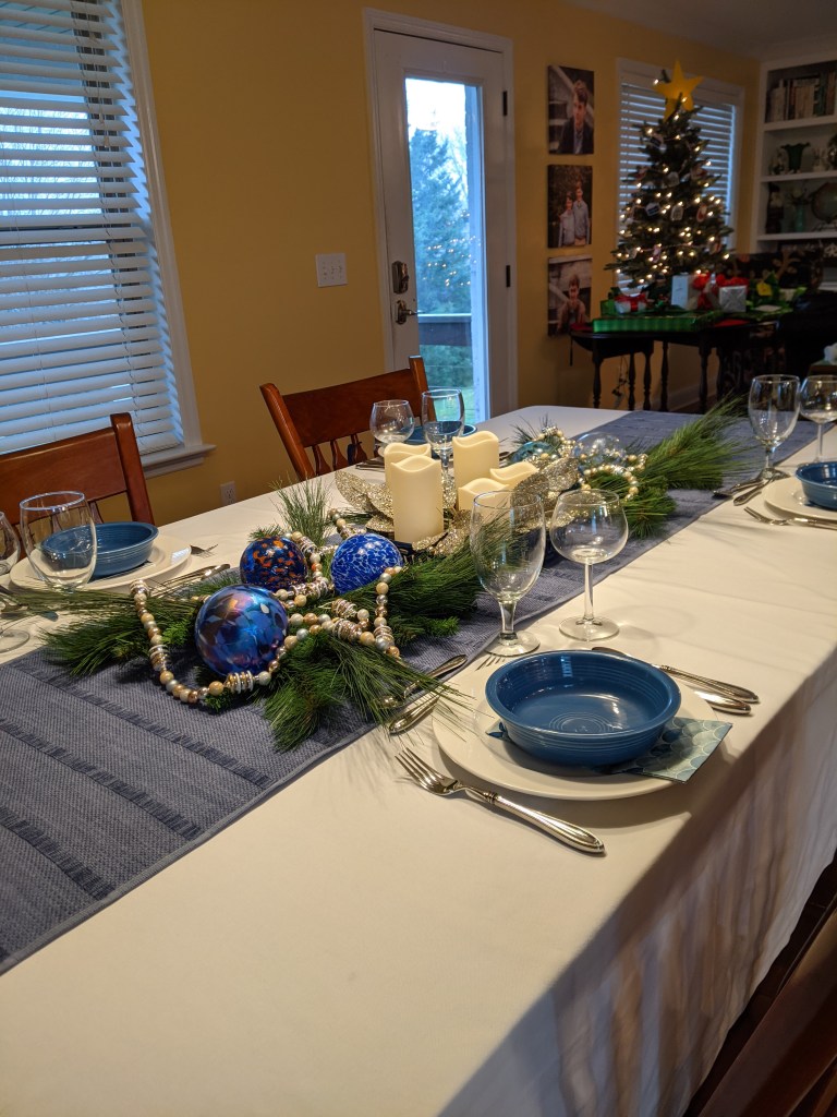 I collect handblown glass ornaments when we travel, and we have ended up with a lot of blue ones which inspired this Blue Christmas table. I started with a medium blue runner and added a low ceramic tray (that I usually have on the coffee table to corral remote controls) with flameless candles, artificial greenery and glittery leaf picks. I surrounded that with more artificial greenery branches, and six handblown glass ornaments. I topped it all with the glass bead garland from Christopher Radko “Shiny Brite”.