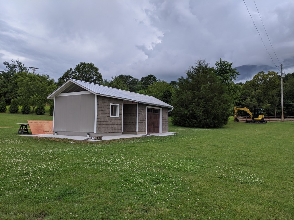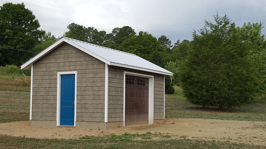 We needed the shed to have a garage door so that we could pull the mower in, and to make access to other items as easy as possible. We also wanted a passage door for when we only needed to grab clippers, shovels, or something small. We clad 3 sides with vinyl staggered antique cedar siding, and the back is Hardie panels. The garage door on the shed is the same one that we used for the house. The passage door is painted with Soft Azure semi-gloss oil and we put a Galvalume roof and gutters on it. This little building really served as the template for what we ultimately did with the exterior of the house.