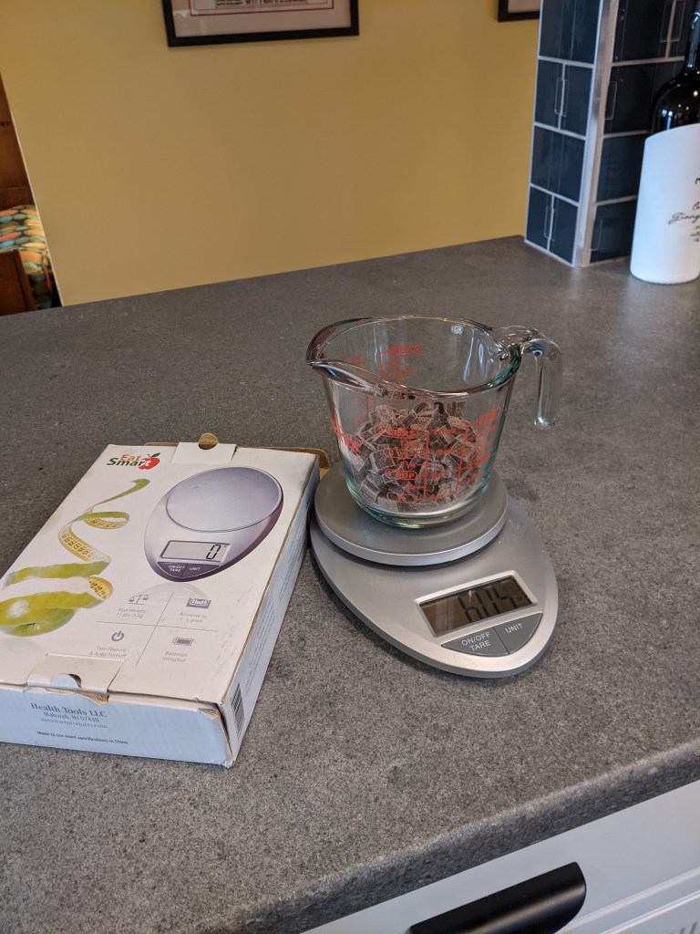 I let it chill for about an hour, and then I made a sour cream dark chocolate ganache/frosting. Take six ounces of semi-sweet (or darker–I used a high percentage cacao chocolate) and melt it in the microwave for 90 seconds on full power. (I always use my handy kitchen scale to weigh my chocolate for recipes–we bought this one originally for a science fair project.)