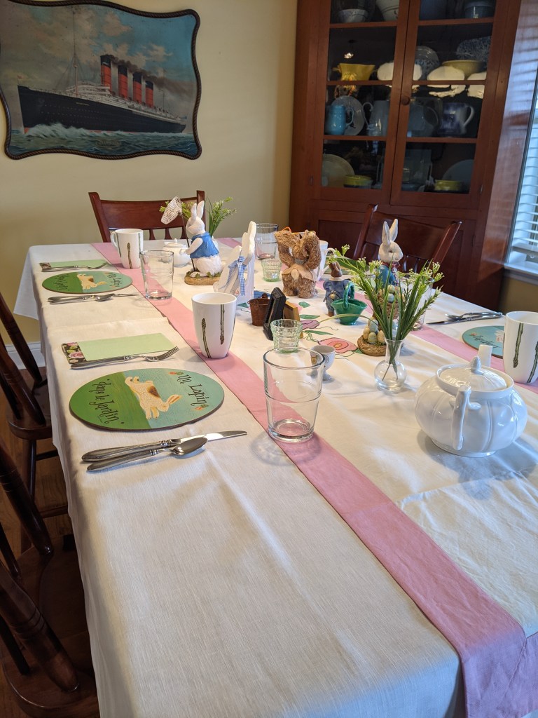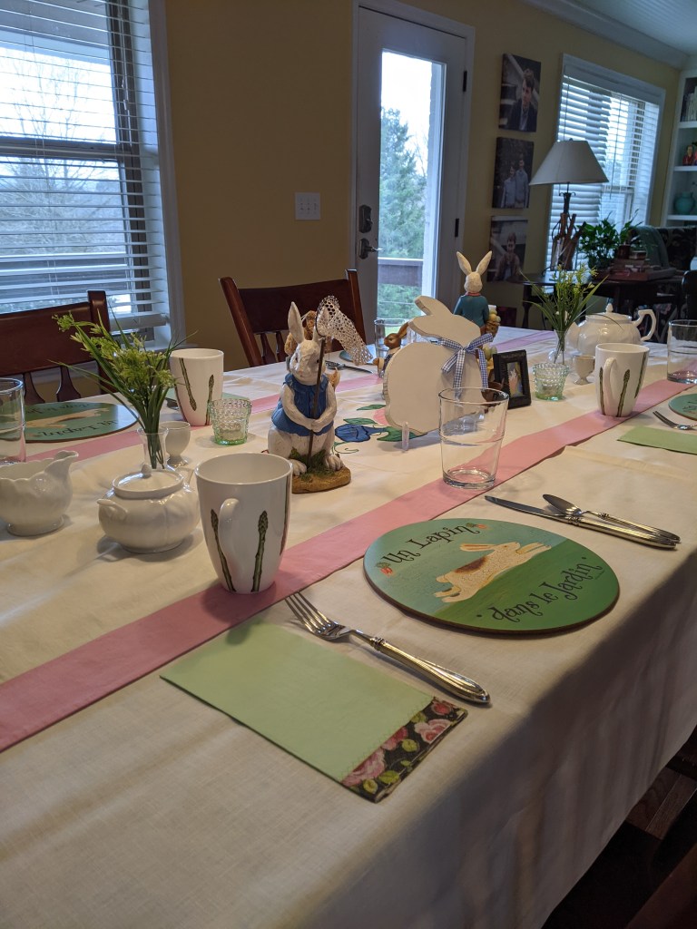 I set the table for a buffet breakfast with bunny placemats, asparagus coffee mugs, flatware and glassware. I also pulled out my pretty teapot, sugar, and creamer in white.