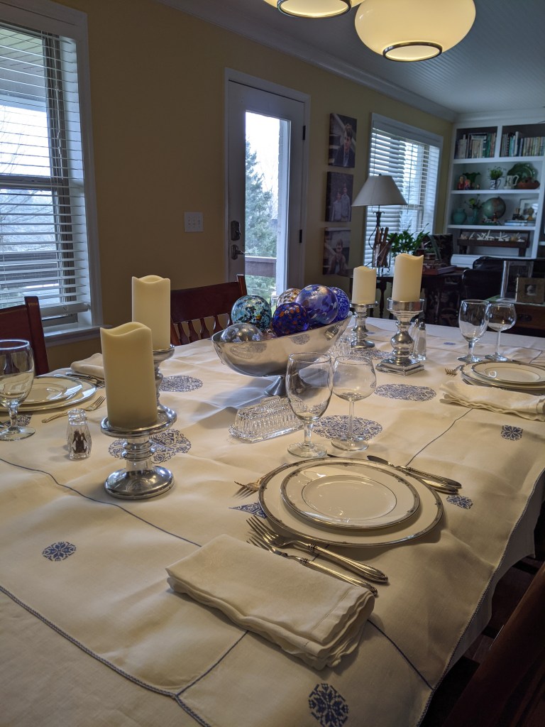 I used my Wedgwood Amherst dinner and salad plates, flatware, glassware, and hemstitched linen damask napkins.