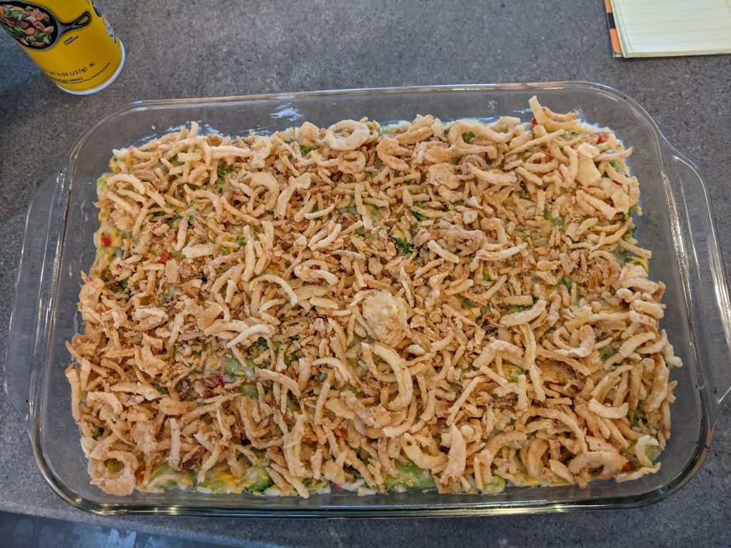 Top with french fried onions and bake at 375 for 40 to 45 minutes, or until the mixture is hot and bubbly and the onions are browned.