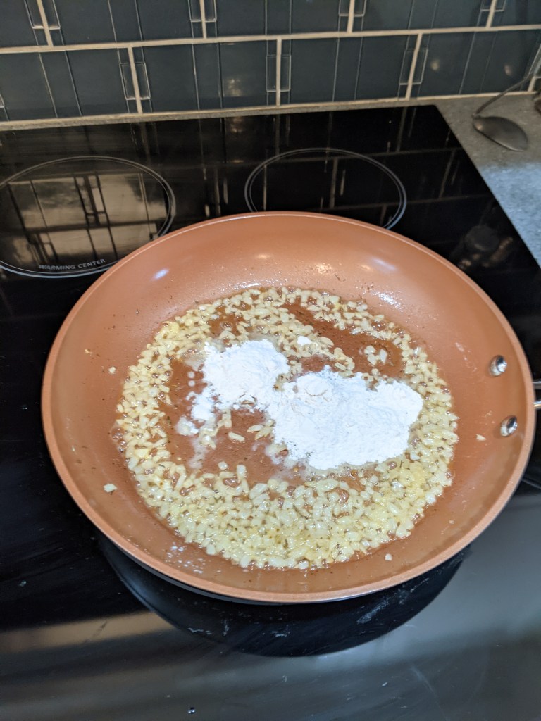 Add poultry seasoning and stir for about 30 seconds. Whisk in flour and cook for 30 seconds.