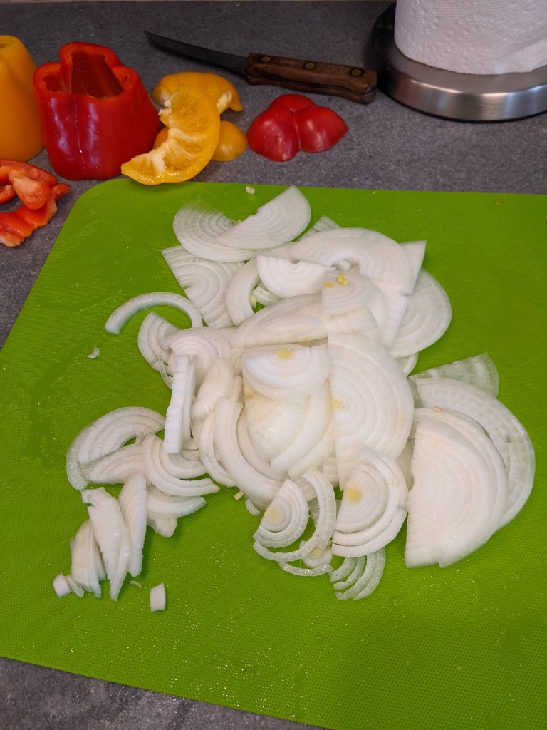 Peel onions, and cut them in half from pole to pole and thinly slice.