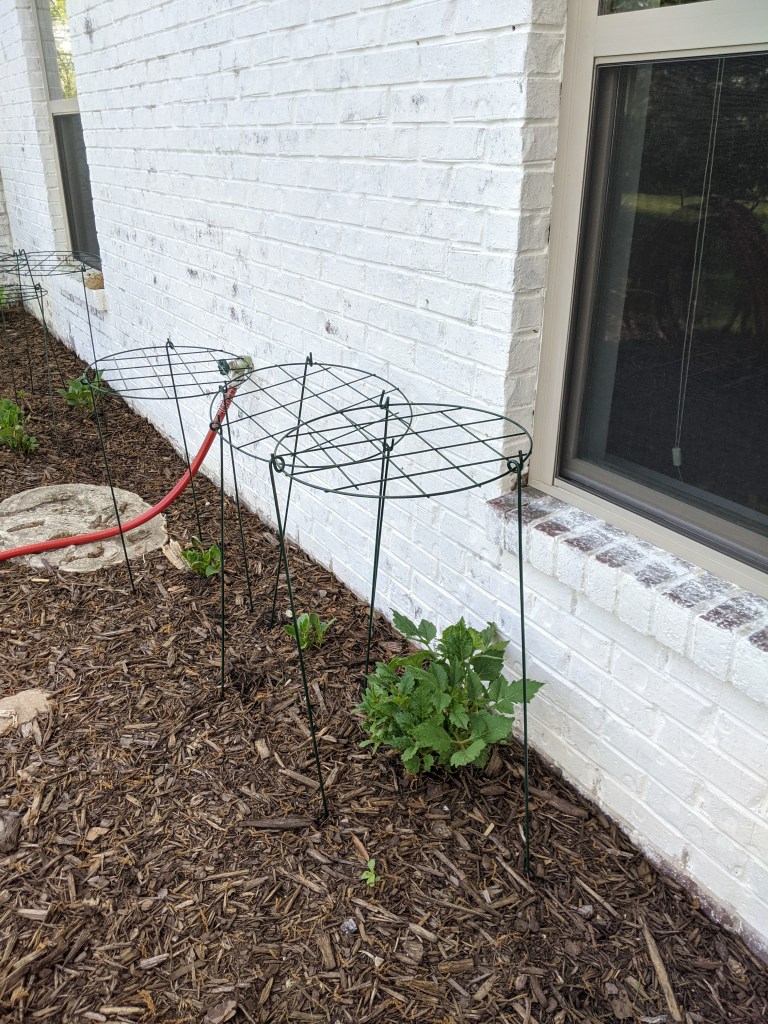 My dahlias are finally emerging from their winter’s nap. The varieties that I have planted get really tall and gangly and require support. These are the grow through heads and 36″ legs that I bought from Kinsman Garden.