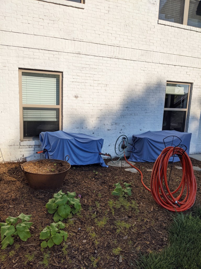 I wrapped my fig trees in beach towels and set an upside down trash can over them. They probably would have been okay uncovered since they are planted against a south facing masonry wall, but I didn’t want to take the chance. Strawberry plants can tolerate the cold–ours stay green through the winter. I left the ferns on the porch because they were protected from the frost, and were up against the brick walls.I have wee tiny basil plants in this pot and they haven’t liked the cooler weather that we’ve had recently. Hopefully, it will warm up and they’ll be happier soon. The rest of the herbs in this garden survived the winter, so I wasn’t concerned about them.My other basil plants. They are a little taller so I was especially keen to protect them. I didn’t worry about the lettuce or arugula because I have grown some through the winter. Anything that is considered a spring crop can take the kind of cold we experienced last night.I have two baby Butterstick squash plants in this tank. I set the cinder block holes over each one, and then covered with a sheet and used two more cinder blocks to secure the sheet. It was really windy last night while we were doing this.The perennial bed on the north side of the house. I have stakes in this garden for candle holders. These served nicely as supports for the sheets so that they didn’t lay on the plants. You should always use fabric to cover your plants, never plastic sheeting, and you should try to keep the fabric off the plants’ leaves so the frost doesn’t land on the sheet, and then on through to the plants’ leaves. The plants that aren’t covered are Lenten Rose because they can handle the cold/frost.This is the cutting garden and I used the plant supports and the frame for the sheets. My husband has some little tiny clamps that I used to secure the sheet to the plant supports. I couldn’t cover the rest, so I hope that they will be okay….We removed these wall baskets from the wall and put them back to back and set them in a large trug tub that kept them upright. I will hang them back up as soon as it warms up.