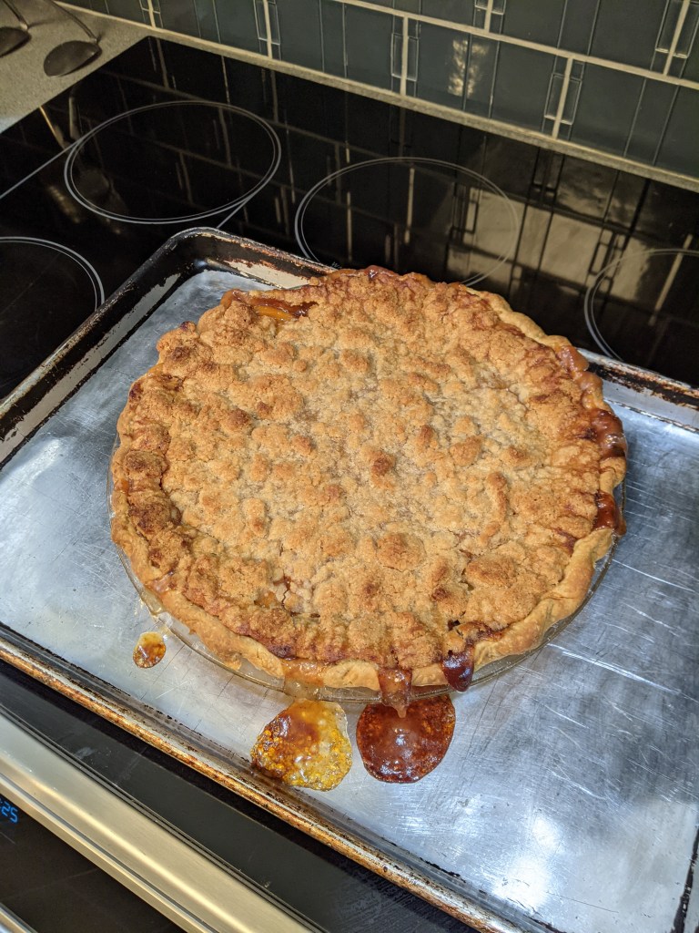 My husband and son met my BIL at his cabin and they wanted to bring dinner. I had some leftover pie crust from the quiches, so I decided to make a peach pie for them. I love a pie with crumb topping and don’t like to make double crust pies, so I settled on making a French peach pie. My friend Susan asked if it was a French peach pie because it had an air of superiority and a disdain for all things non-French. I told her that I thought that it was just the crumb topping.