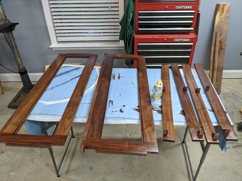 This would have been a really simple project except that Chris is not allowed to screw anything to the walls, otherwise we would have installed some metal standards and brackets and glass shelves. So, Mike and Chris designed a freestanding shelf that could sit on the stone backsplash. Mike didn’t want it to feel cave-like, so he added places for glass shelves to sit in the walnut shelves.