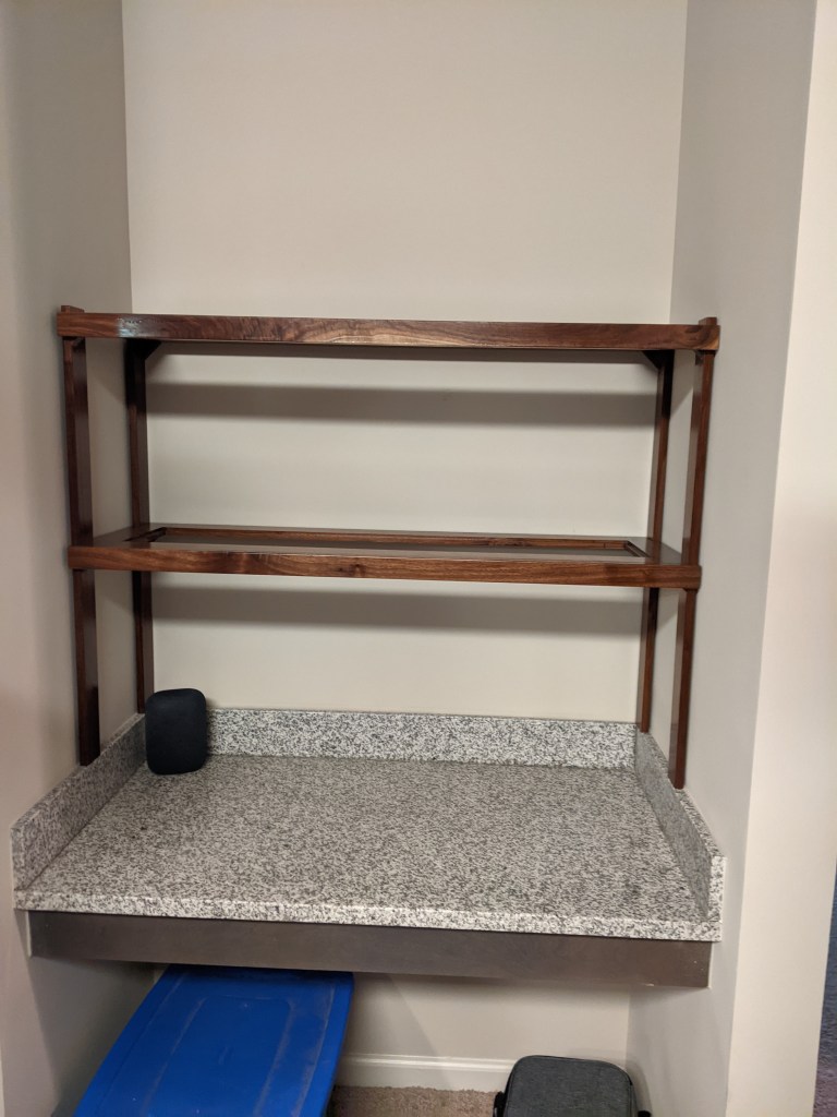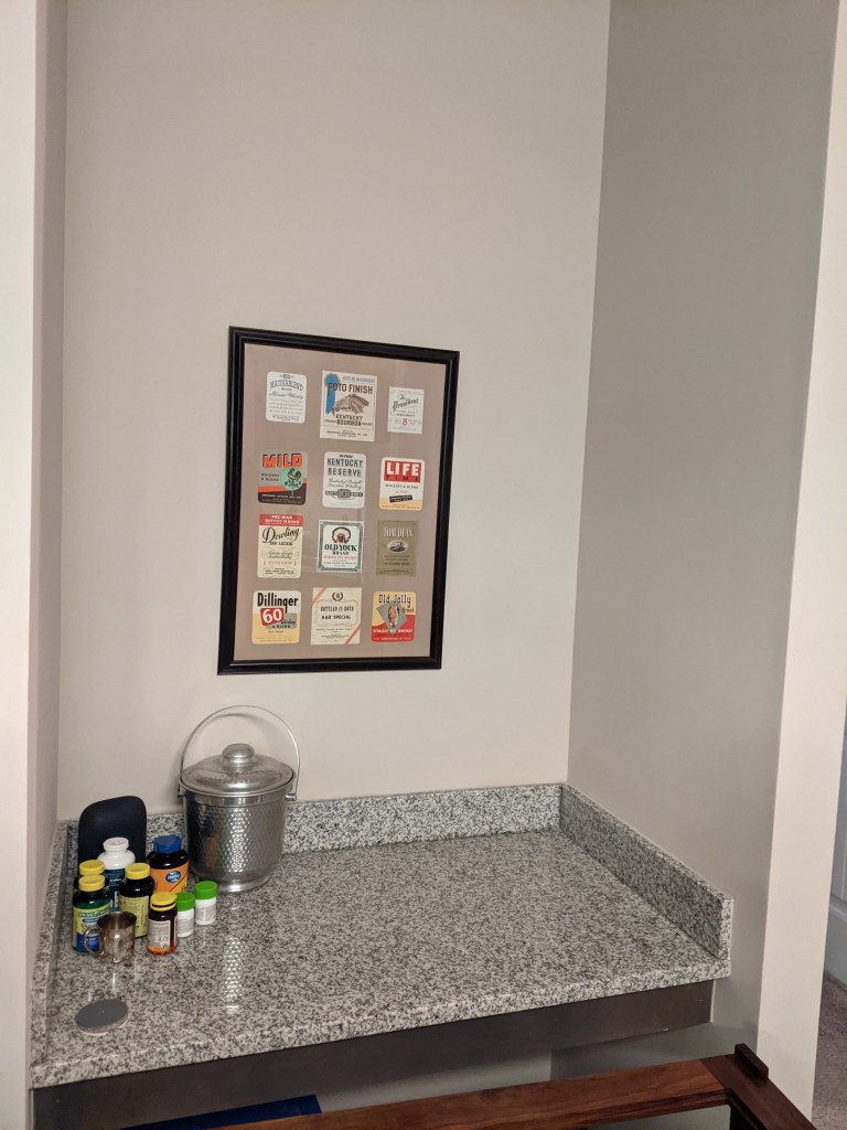 Chris moved into an apartment last October. It’s a nice apartment, but it has a built in desk right in the main traffic path from the front door to the bedroom which makes it unusable as a desk because the chair would always be in the way. Being the good parent that I am, I suggested that it would make a fantastic bar because of its proximity to the living/dining room and kitchen.