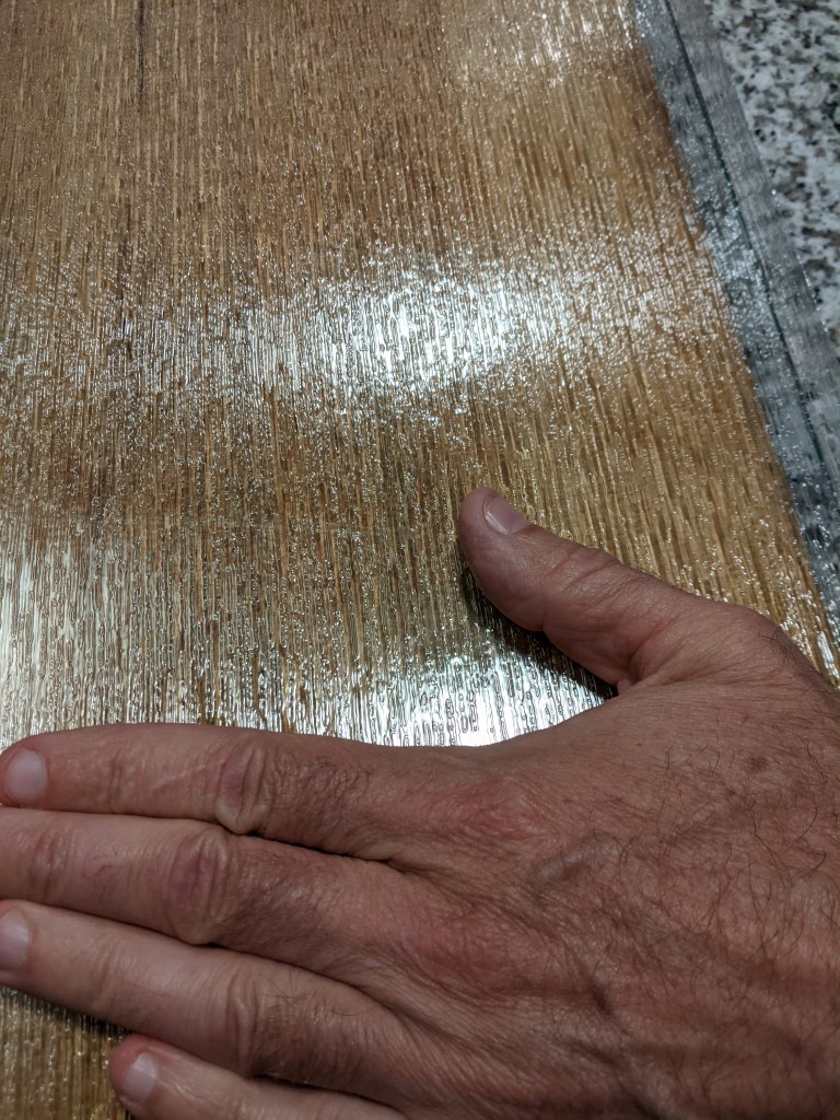 We really wanted to use rain glass for the shelves, but tempered glass only comes in clear–and you MUST use tempered glass for a project like this. Regular glass isn’t structural–even for this little weight. So I found a cling film that you can put on glass that makes it look like rain glass. Pretty tricky…