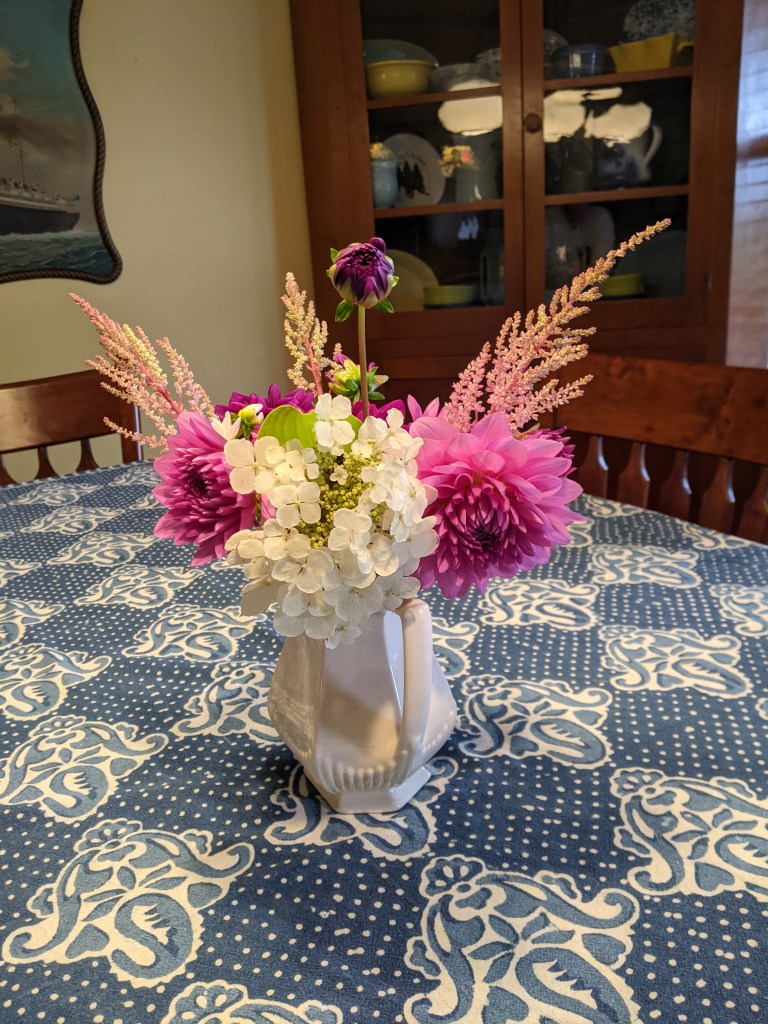 I ventured a little further afield for the flowers for the dining table and added hosta leaves, astilbe, and oak leaf hydrangea flowers.