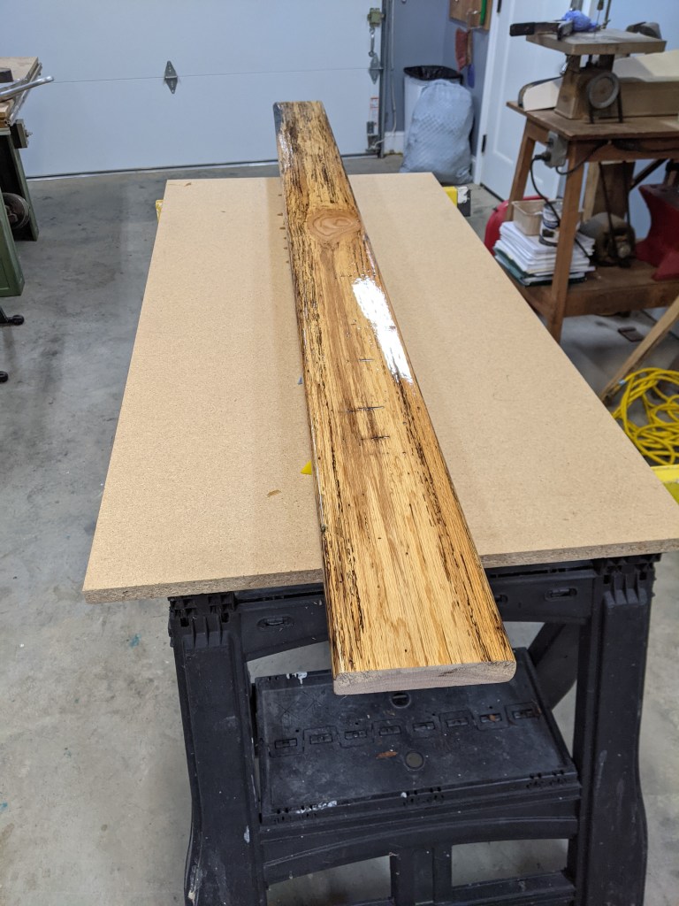 I wiped down the legs with paint thinner and sprayed them with laquer to give them a protective coating. These legs have a place for a stretcher to provide additional strength and rigidity. Mike found an old board with lots of character in the wood shed, so he jointed it and routed the edges and put lots of polyurethane on it.