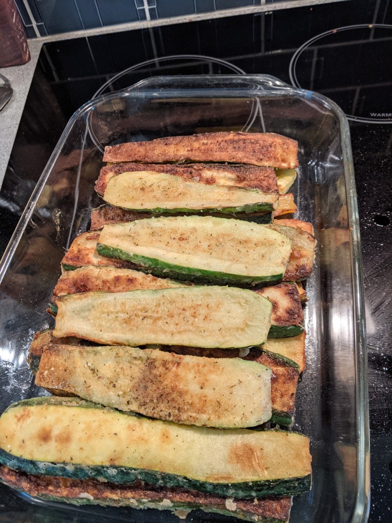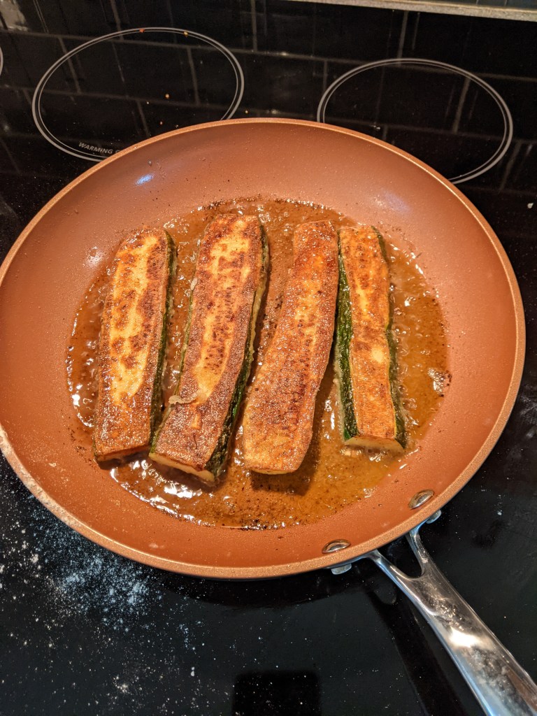 I bought yellow squash and zucchini from Costco. I scrubbed them well and cut them into 3/8″ planks (cut the long way). I combined about 1/2 cup of flour, 1 tsp garlic salt, and 1 tsp dried oregano in a bag and dredged 3 or 4 of the planks at a time. In the meantime, I heated 4 tbsp of olive oil in a large non stick skillet. I cooked the squash on both side until brown.