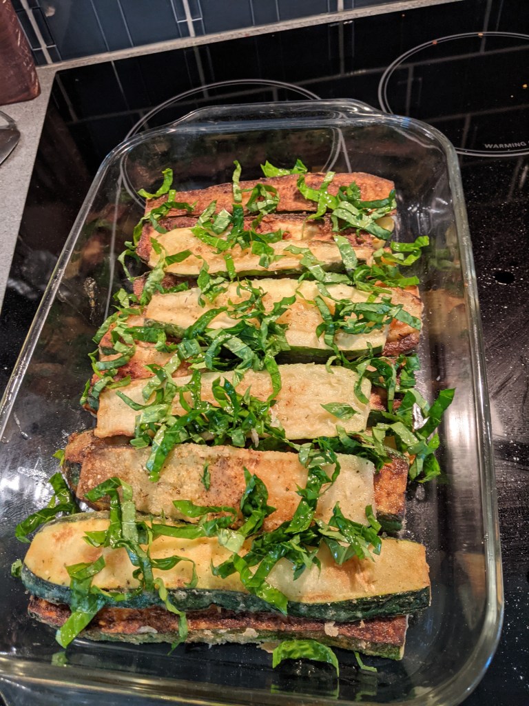 I also gathered about 20 basil leaves and sliced them thinly and sprinkled them over the squash.