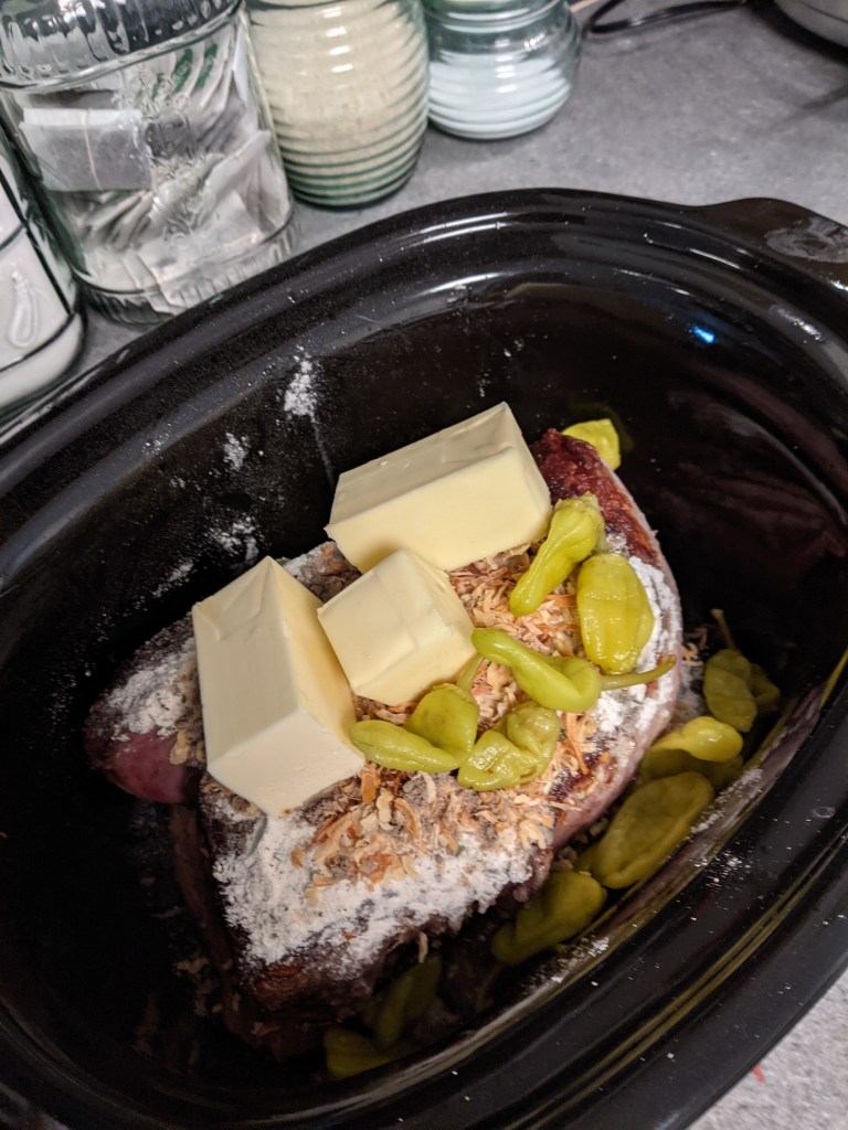 Once browned, place in crock pot, and sprinkle the soup and dressing mixes over the top. Place the butter on top of the meat and the peppers around the meat and on top of the meat.