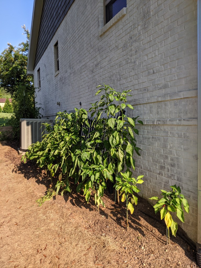 These peppers are all the same variety and all planted at the same time…. I don’t have an explanation except there must be a significant difference in the soil. We’ll have to work on that.