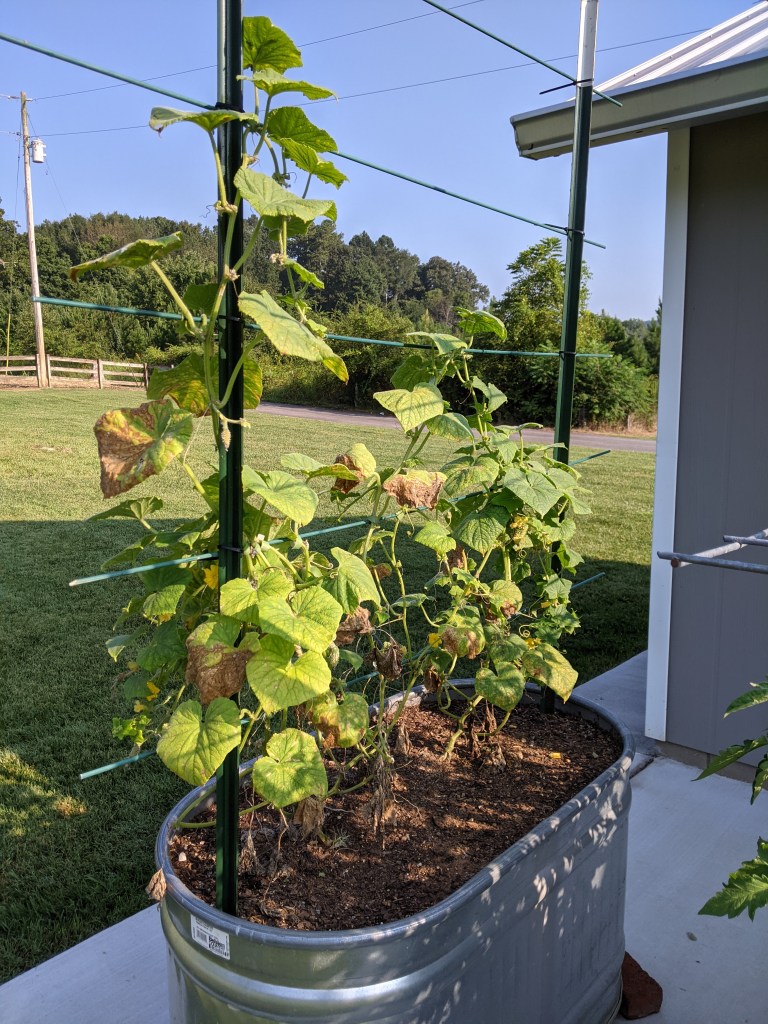 This is our second batch of cucumbers. The first batch gave me TONS of cucumbers and I have the pickles to prove it. This second batch has struggled all along and I found little worms in the cucumbers this morning, so these also got pulled up right after I took the picture.