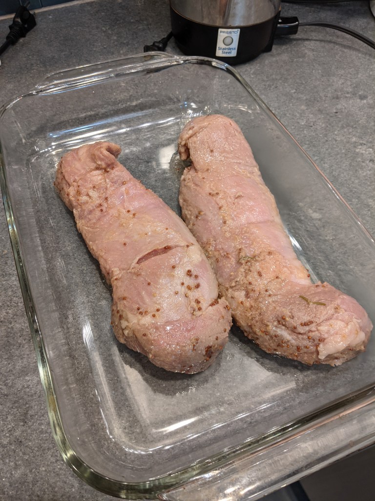 Combine all the ingredients and mix well. Place 3 to 4 lbs of pork tenderloin and the marinade in a zip lock bag and be sure to move the meat around so that it is all in contact with the marinade. Squeeze all the air out and close the bag.