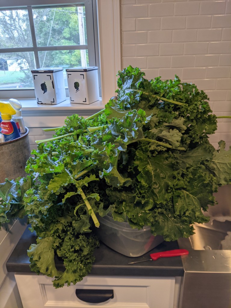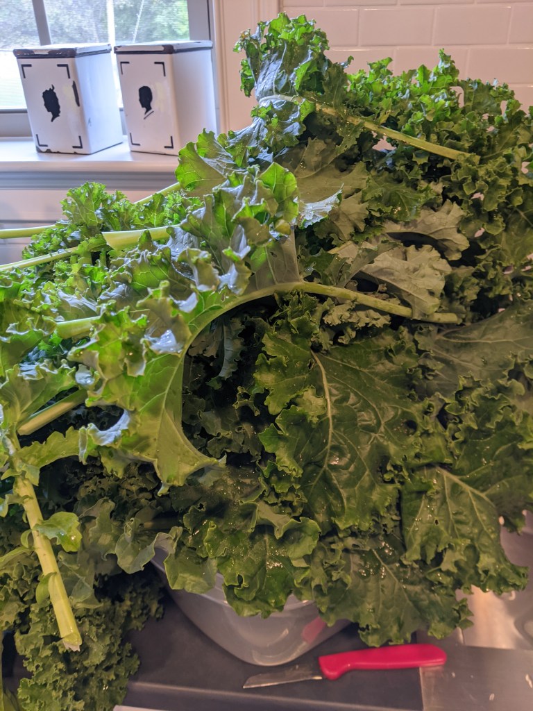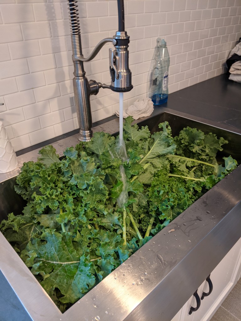 I have a 36″ sink in the laundry room and you can see how full it was. To get it ready to use, I cut the leaves off the stem and washed the kale twice. We didn’t have a lot of worms, but there was definitely worm poop on it. I tore it into pieces and put it in the salad spinner in batches and washed it a third time. It filled two of my largest food storage containers.