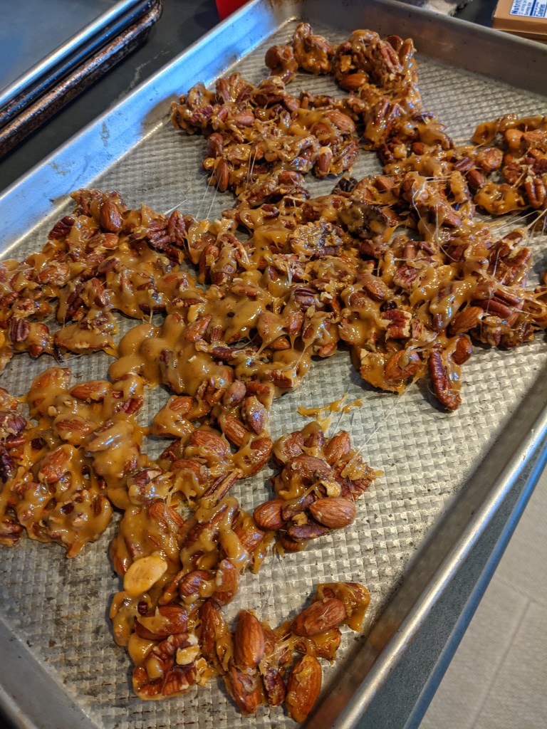 Add 3 cups toasted whole almonds and/or pecans after you remove from heat and stir well. (Toast on a tray at 300 degrees until brown and fragrant.) Spread evenly on a greased sheet pan.