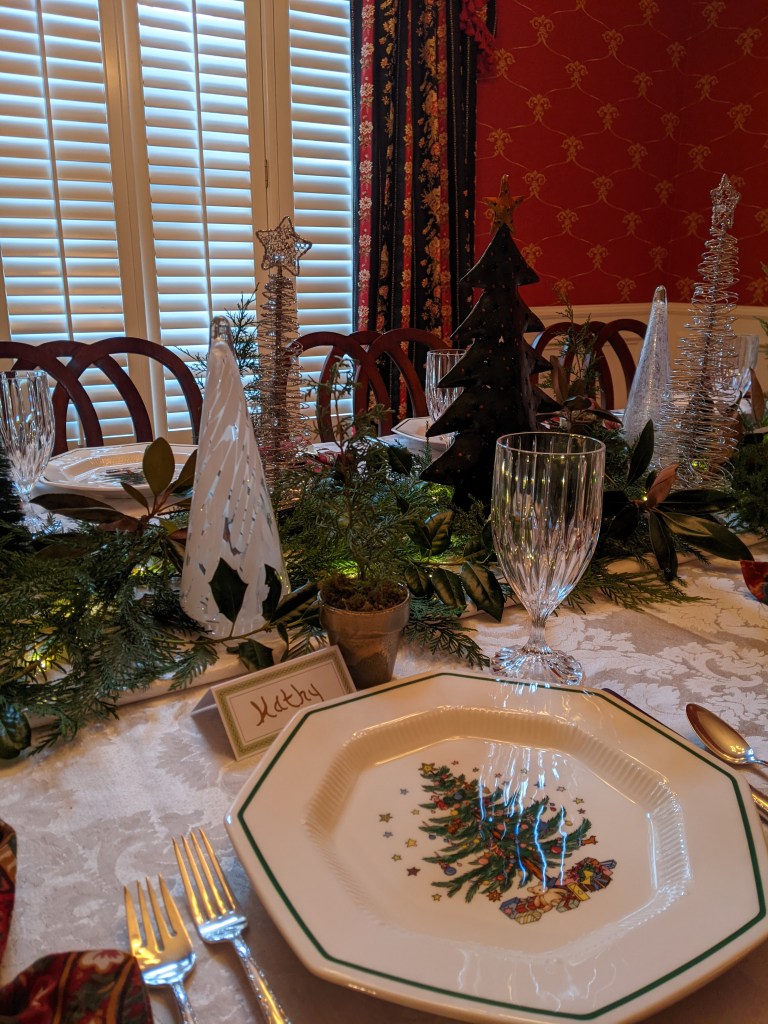 She had already decided on a Christmas tree theme–using her Nikko Christmas plates, and an assortment of table top Christmas trees. I have a metal Christmas tree at my house that matches the tree on the plates, and I brought a couple more, and lots of other stuff to play with–beaded garland, place cards, and cute little “trees” to put at each place to reinforce the Christmas tree theme.