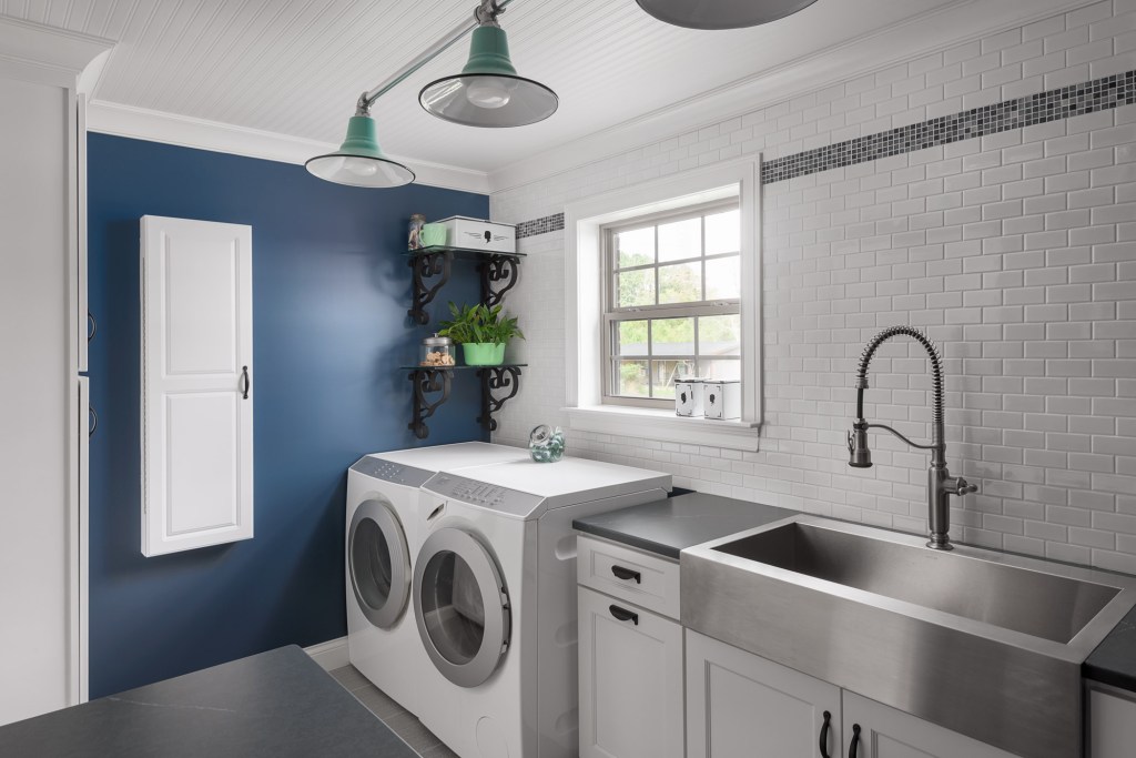 The colors that we chose for these two rooms were white for cabinets and trim, black hardware, navy blue (from the mosaic tile band in the laundry room), and a jadeite green from the light fixture in the laundry room.