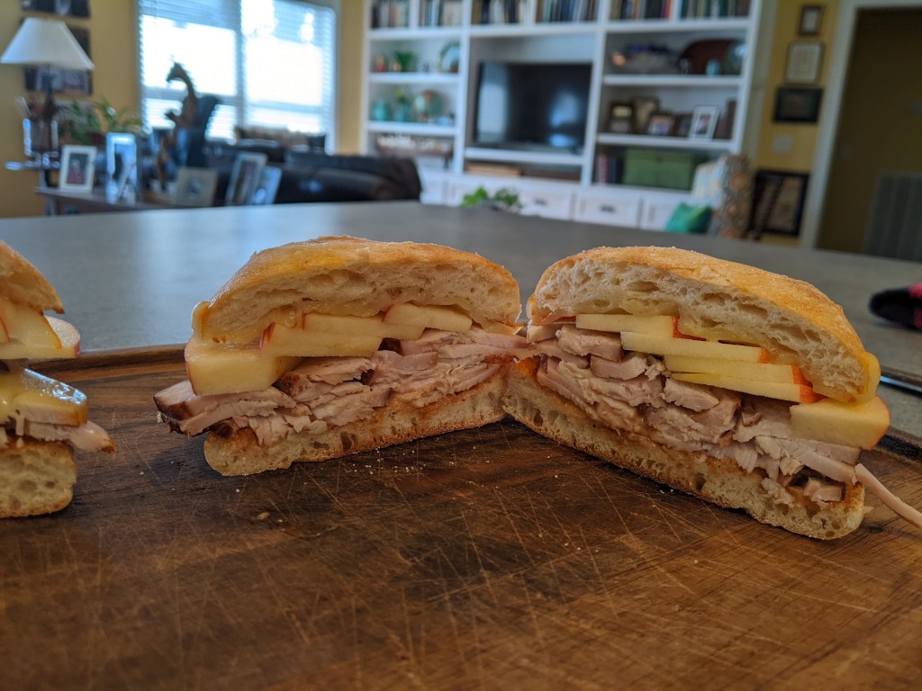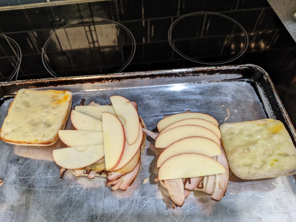 I put this under the broiler and removed it when the cheese was melted and the turkey was steaming. I topped the turkey with apple slices.
