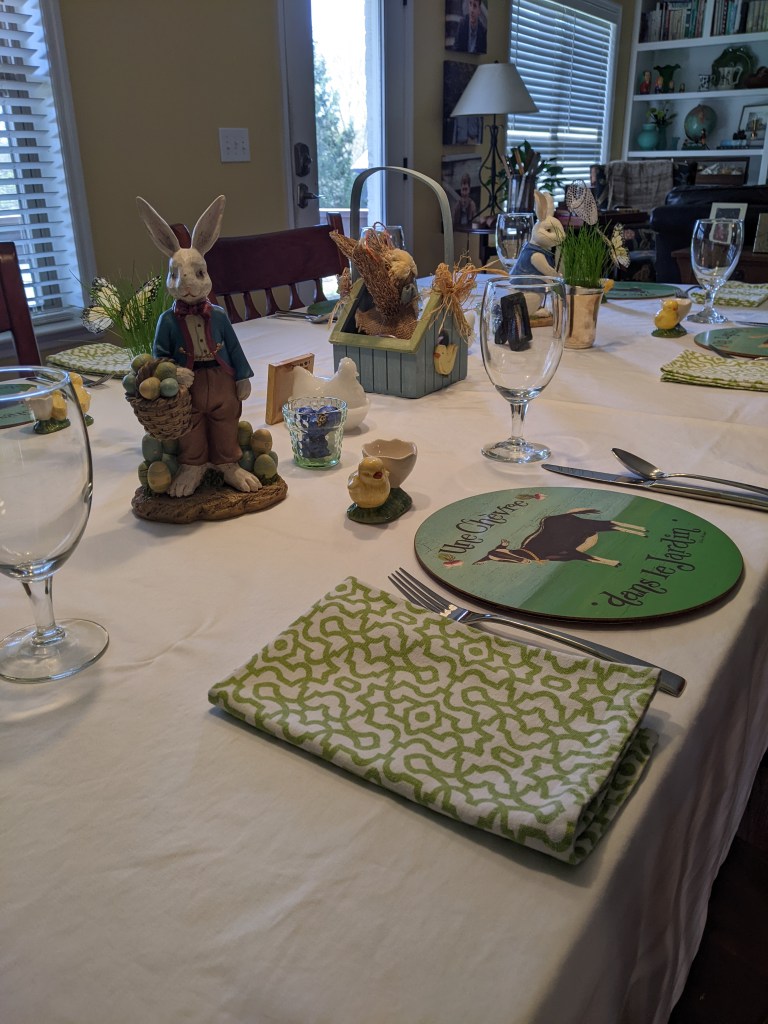 This table features a lot of blue, green, and yellow. I used two composite bunnies, a coir bunny, green hobnail votive holders filled with chocolate eggs, two milk glass hen on nest, some little paintings, and the cute egg cups. I set the table with some Pimpernel place mats for a brunch buffet.
