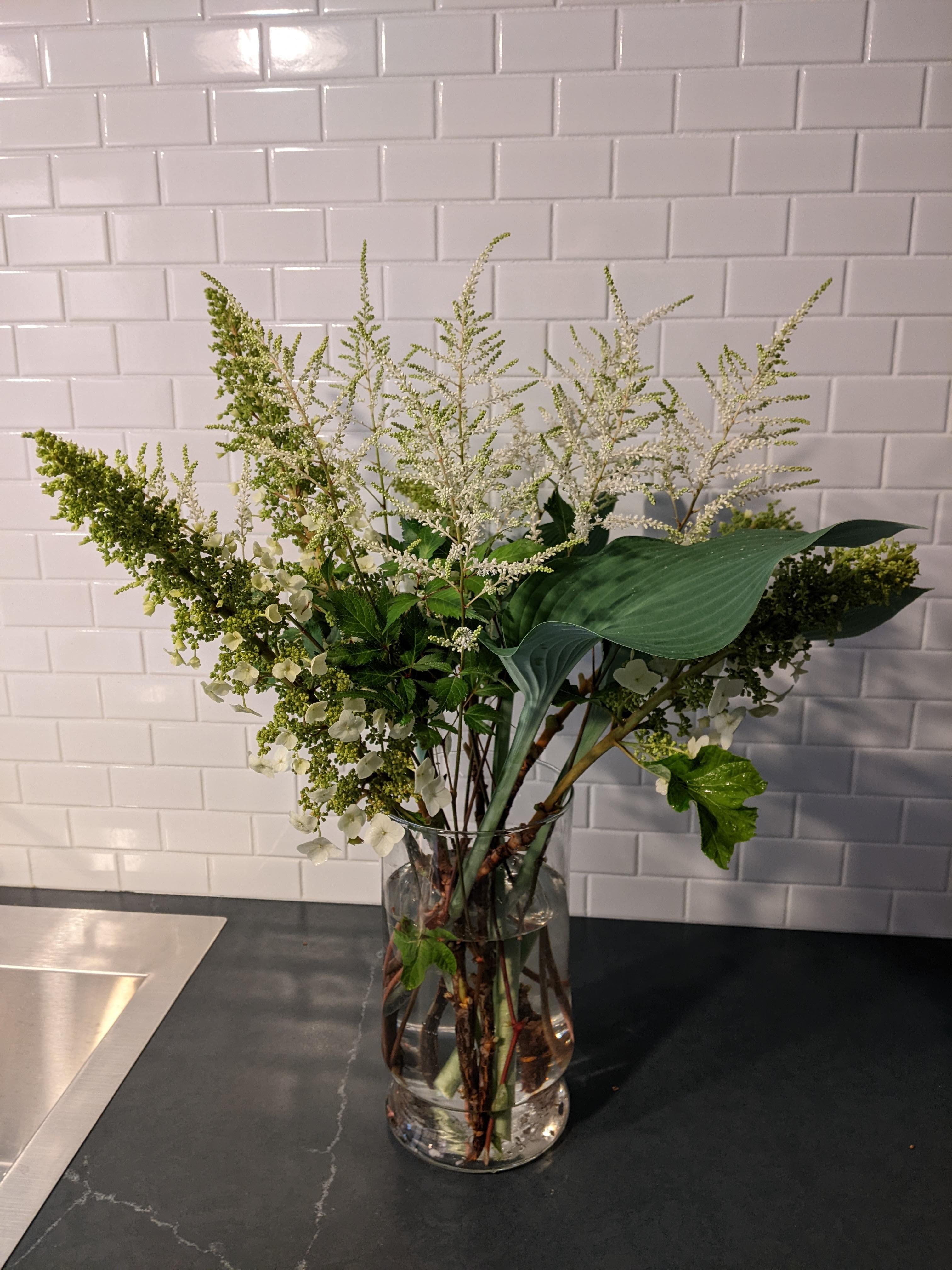 Right now, I have Oak Leaf Hydrangeas and white Astilbe blooming. I cut both with very long stems. I have never cut an Astilbe this long. I also cut some Blue Krossa Royal hosta leaves for some greenery.