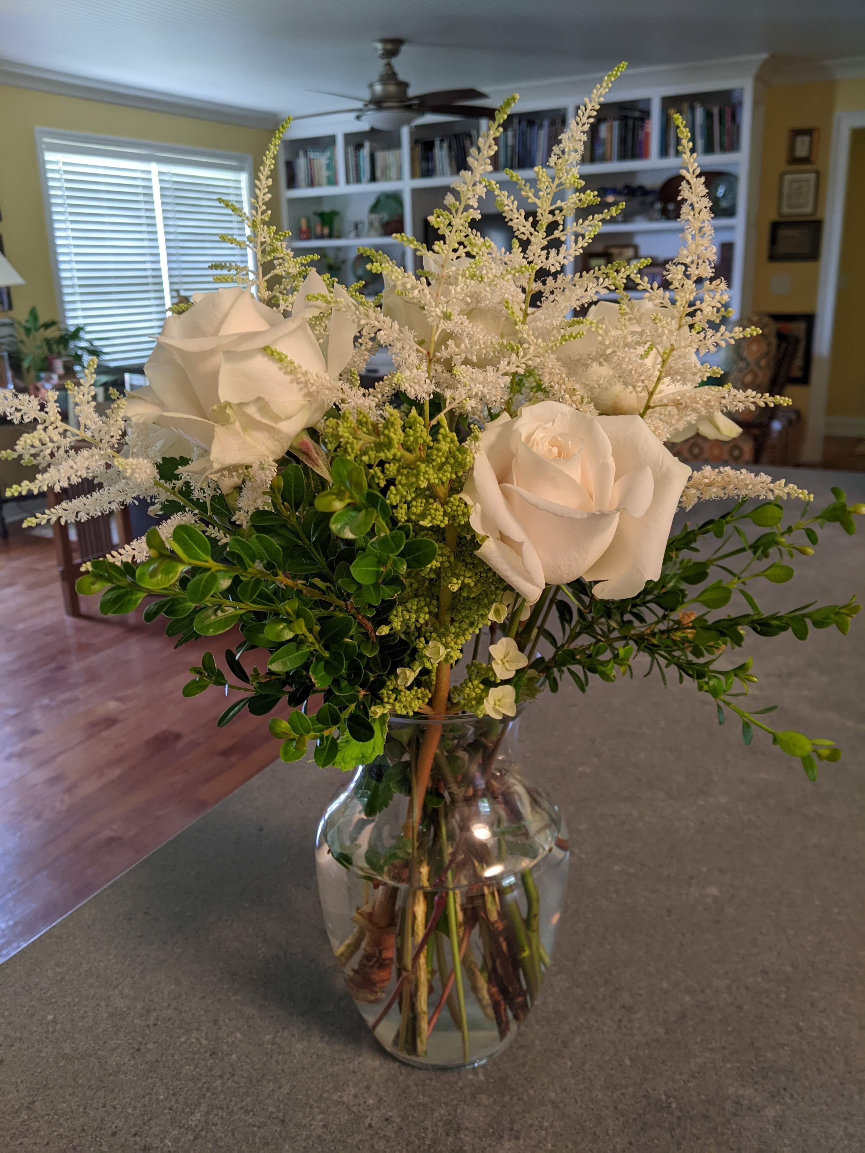 Aldi had some really pretty white roses when I stopped in there yesterday, so I got some. They would have been fine on their own, but I added Oak Leaf Hydrangea, Astilbe, and some boxwood and it turned out like this….