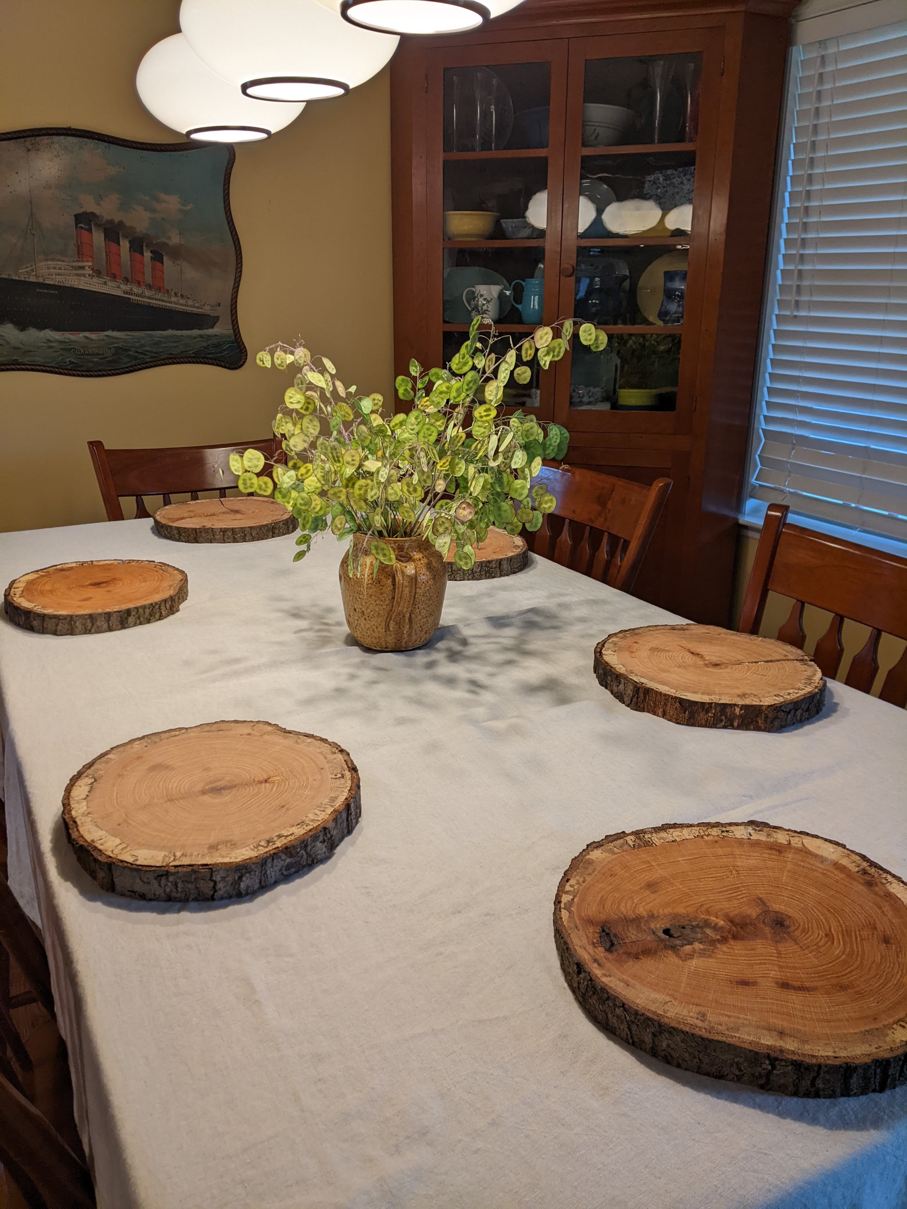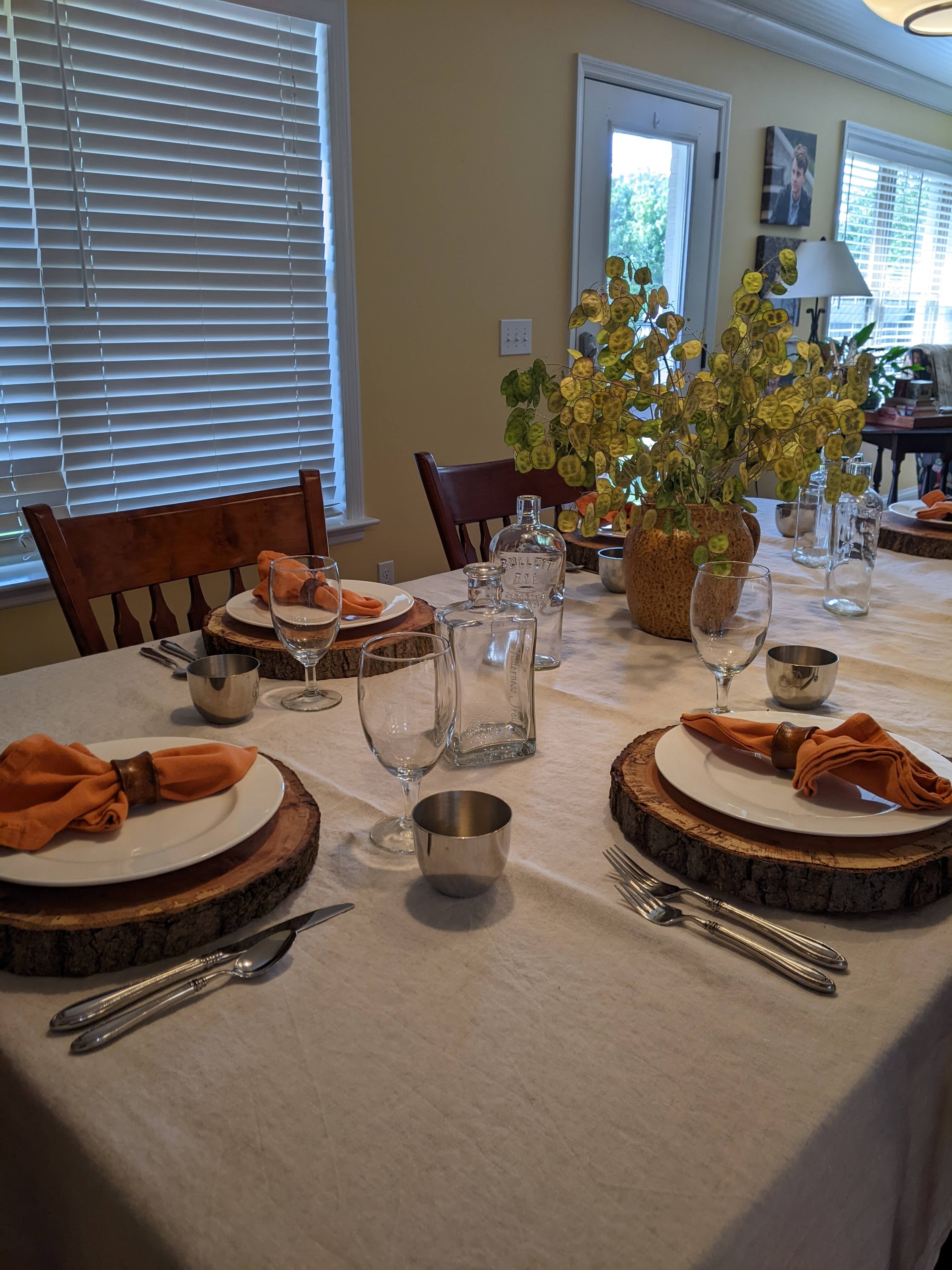I started the table with a parchment colored washed linen tablecloth and I added the log rounds that my husband made for me a couple of years ago. Not surprisingly, a couple of them have cracked and they aren’t quite as level as they used to be, but I still think that they are rustically charming and I love my husband for making them for me. I need to let them sit out more because you can definitely tell which ones have been getting used versus the ones that haven’t.