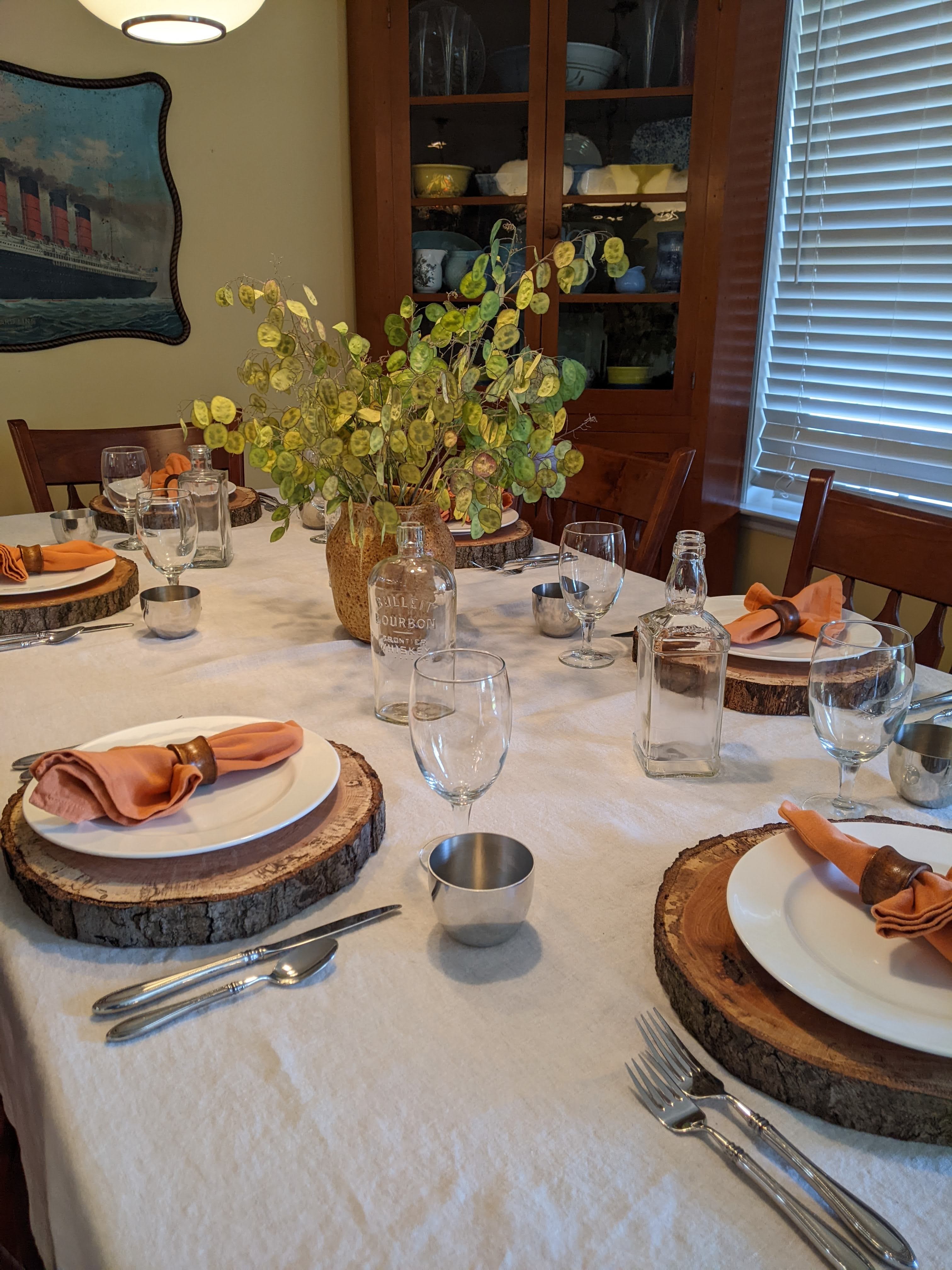 I imagined this table as a bourbon dinner and used white dinner plates, russet colored napkins in wooden rings, water glasses and pewter Jefferson cups. I added some bourbon/whisky bottles to the table as well.