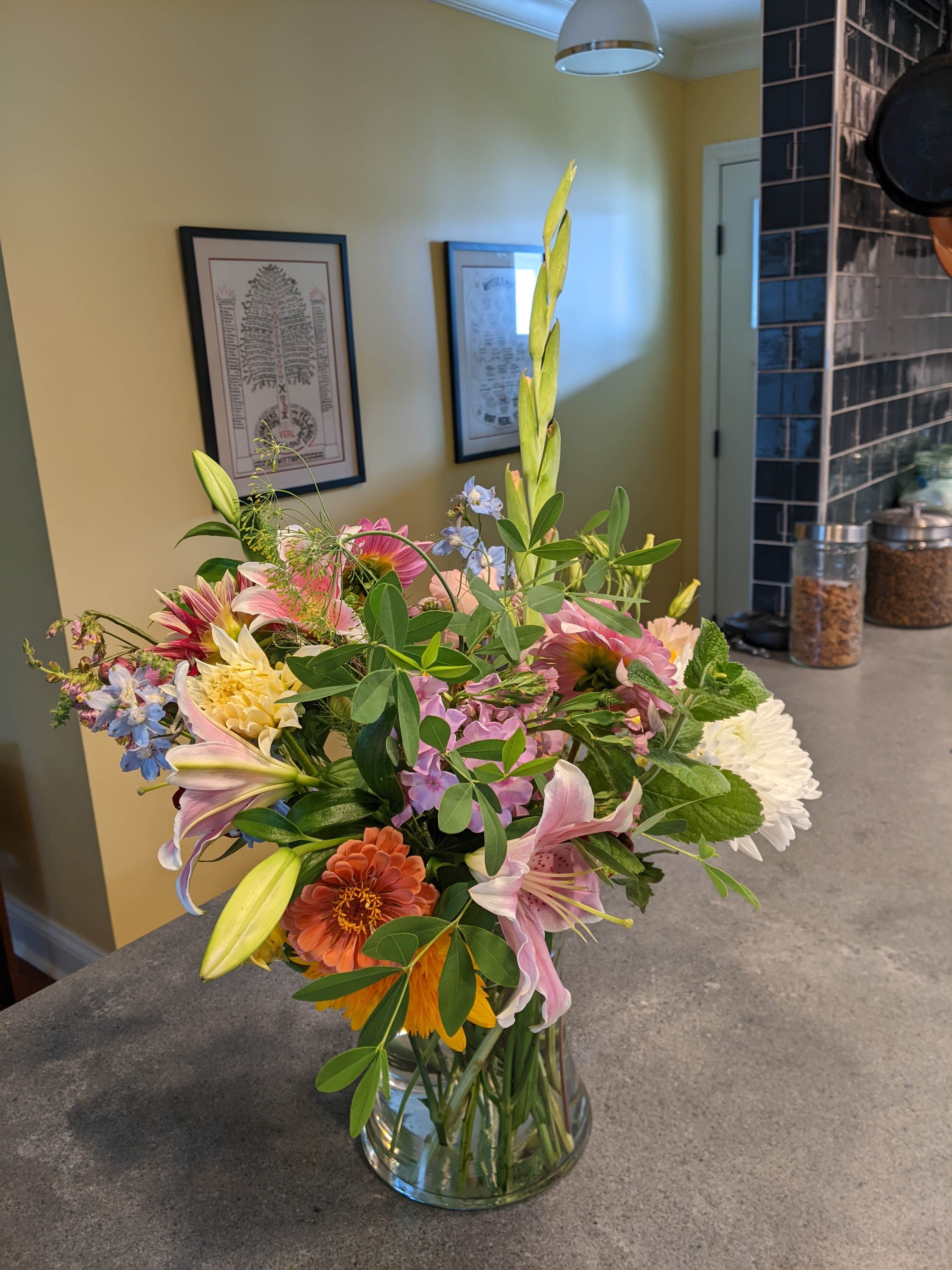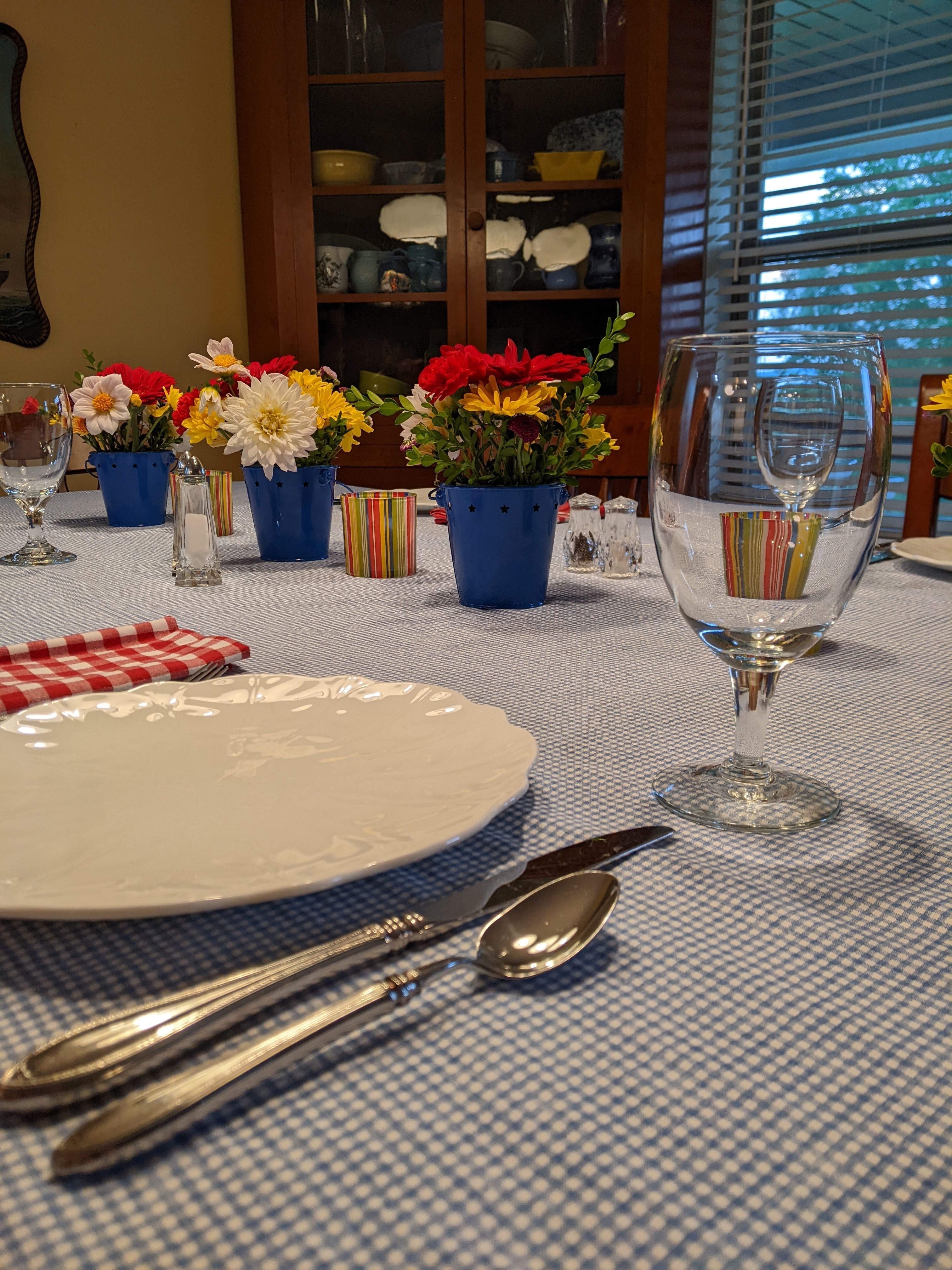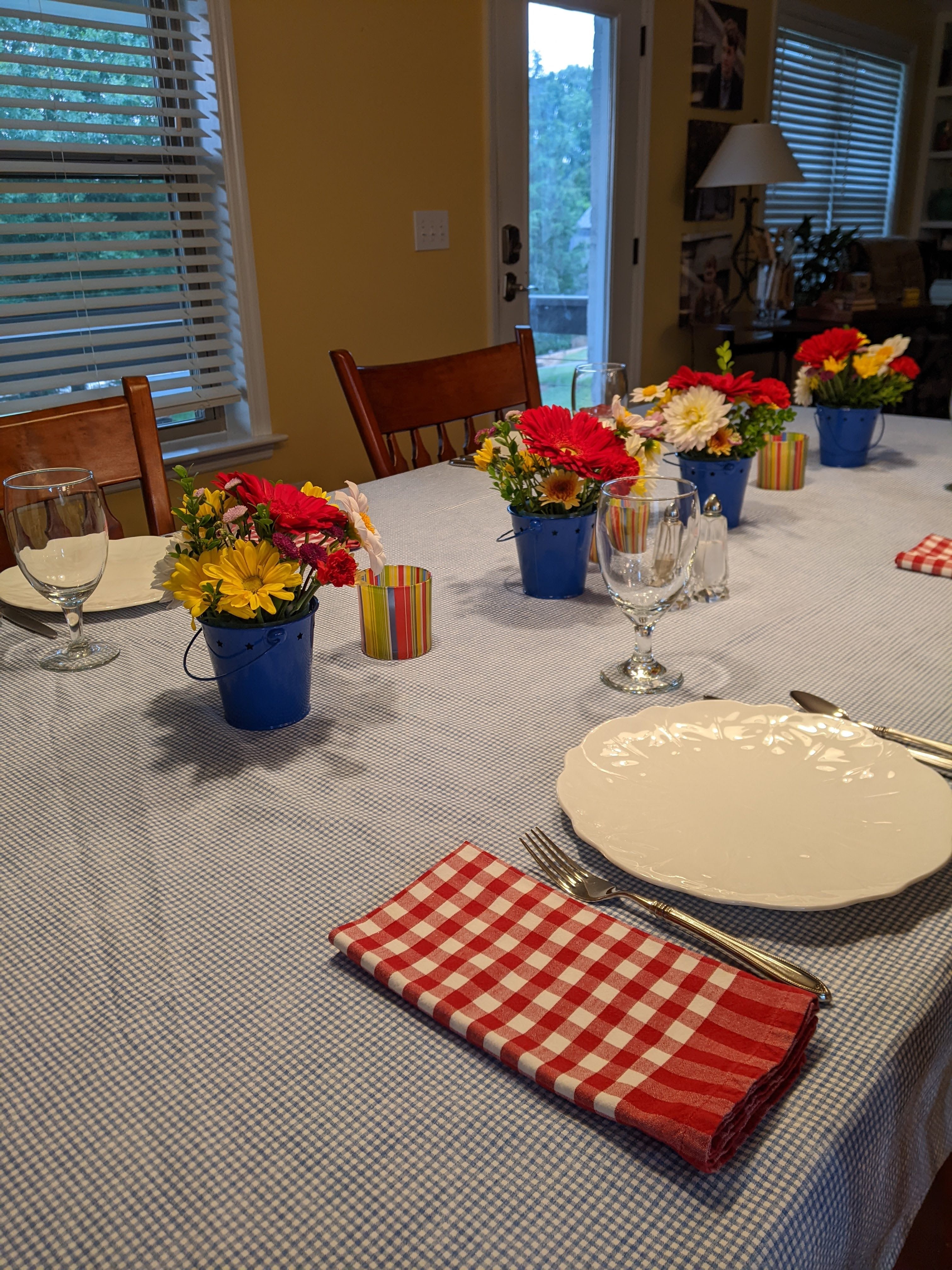 I will put a blue and white tablecloth on the peninsula to use as the buffet and my latest flower arrangement from my summer subscription will be the centerpiece. The colors are a good match with the ones on the table, but they are so gorgeous–zinnias, love in a mist, lisianthus, sunflowers, gladiola, false indigo greenery (I think), lilies, phlox, delphinium, and statice. I added a few flowers from the bouquets I bought at Aldi, along with some dill, and dahlias (white, pink, and red/orange) from my own garden. I also stuck some sweet potato vine in the vase.