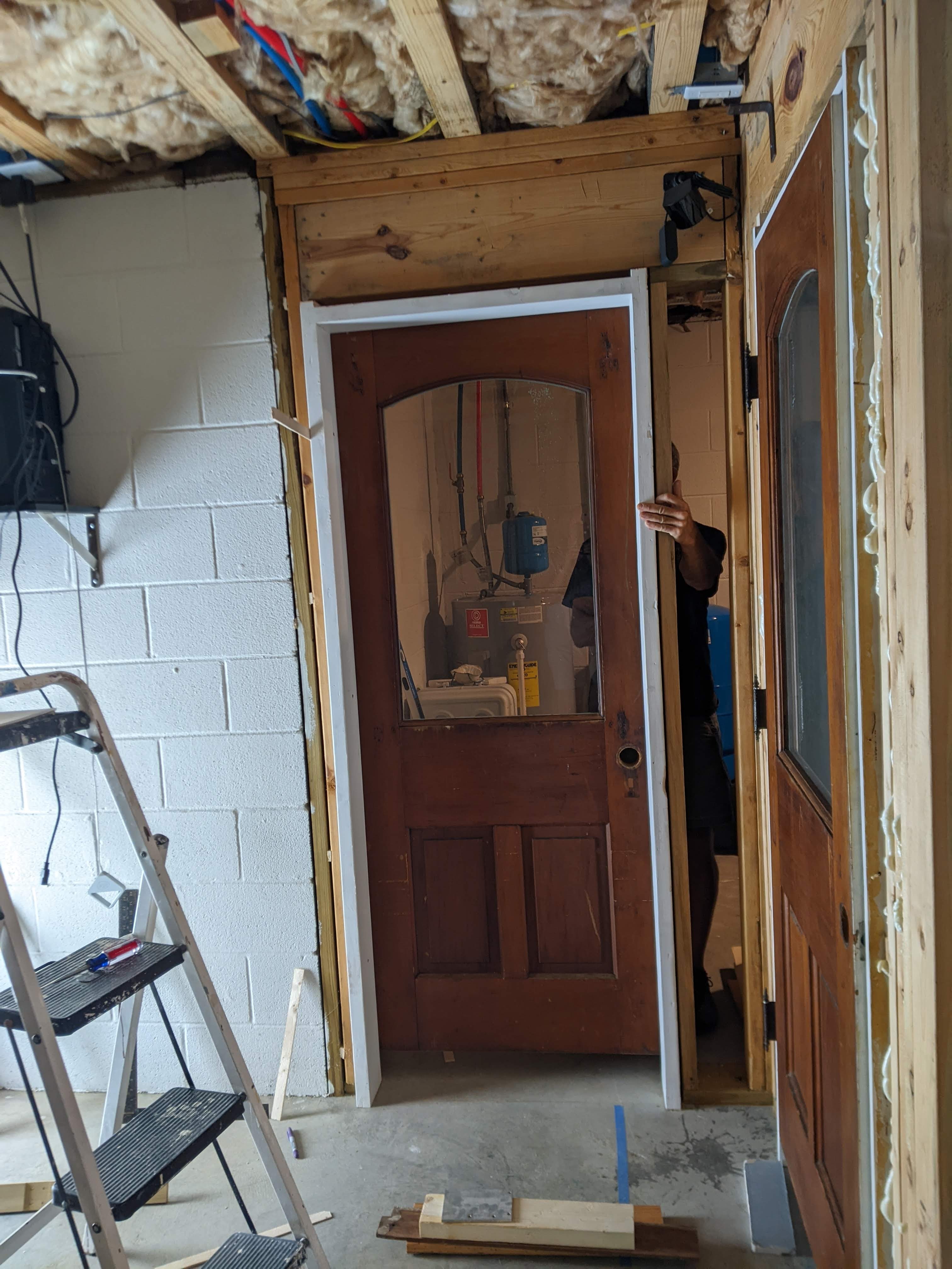 My husband will use the other exterior door that we bought for his office. The glass is broken, so he wants to replace the glass with something that obscures the view–like ribbed glass. We need two doors for the bathroom–one for the closet to hide the HVAC unit, and the other for the entrance. We may build a toilet room in that bathroom, which would use another door.