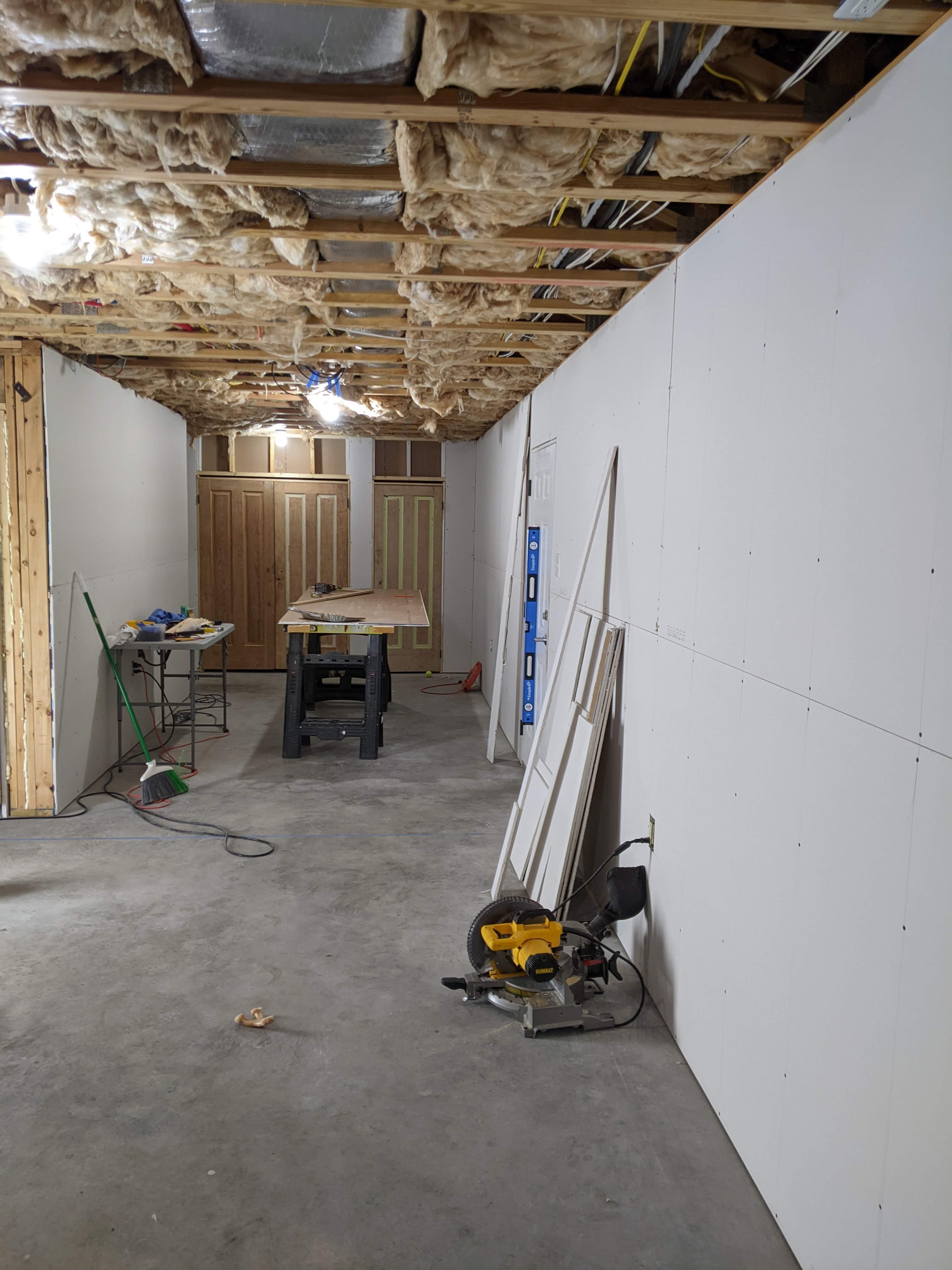 My husband has wanted to hang the drywall because the exposed insulation just sucks the light out of the room because it is dark and not at all reflective. So, we ordered drywall when we ordered the materials to frame out the closets in the basement. Also, in preparation for hanging drywall, we have watched multiple videos on YouTube about how to do it properly, and tips and tricks for the easiest way to do it. (Yes, we are the most glamorous people you have ever seen.)