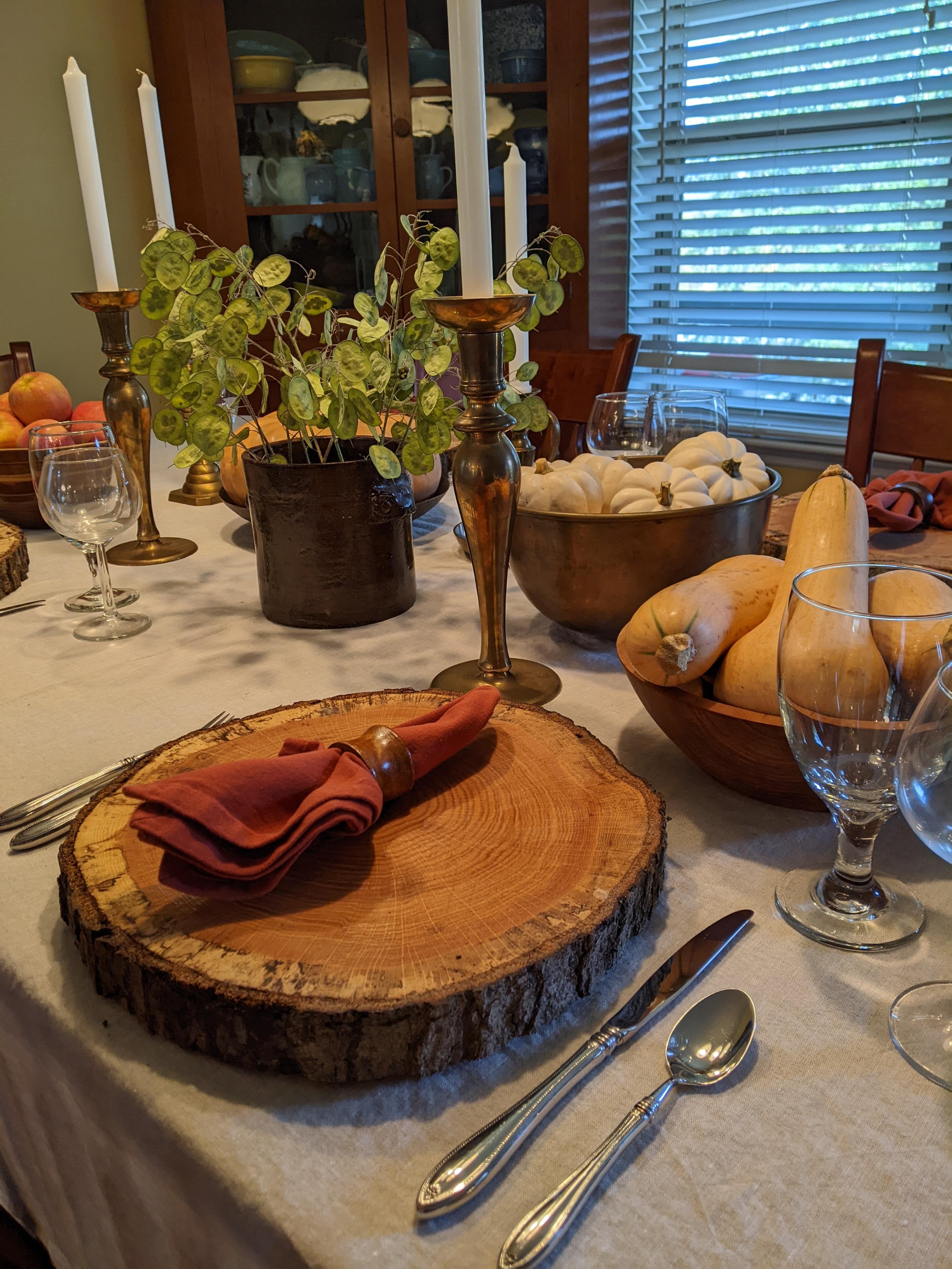 For the place settings, I started with my log slice “chargers”, flatware, glasses, and beautiful russet napkins in wooden rings. I am imagining this as a buffet dinner to celebrate a successful harvest.