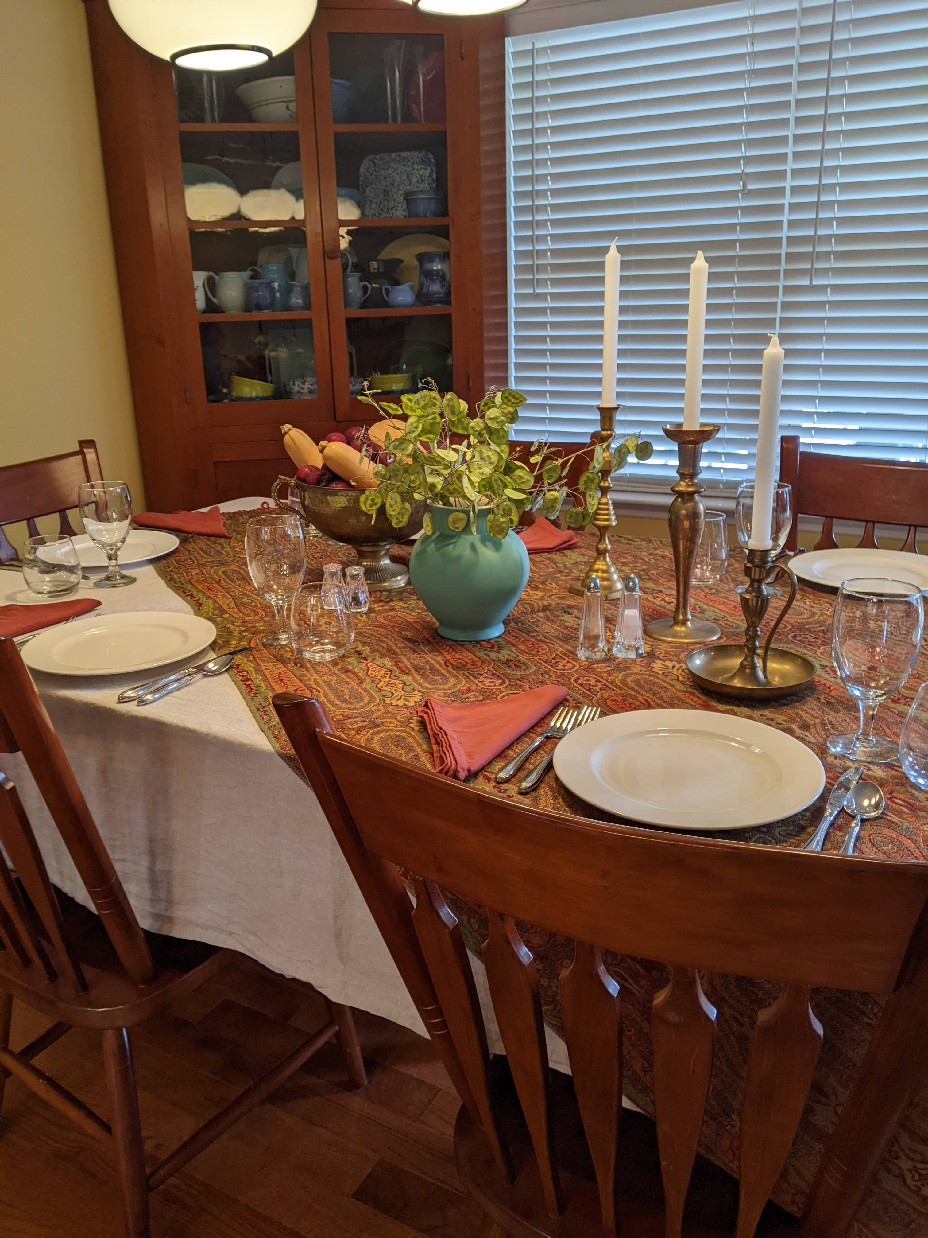 For this one, I used a wool throw over my natural washed linen table cloth. I love the colors in this throw and they could not be more perfect for fall. I used some brass candlesticks, a pretty aqua vase filled with lunaria, and a bowl of butternut squashes and plums. I finished it with coordinating napkins, white plates, flatware and stemware.
