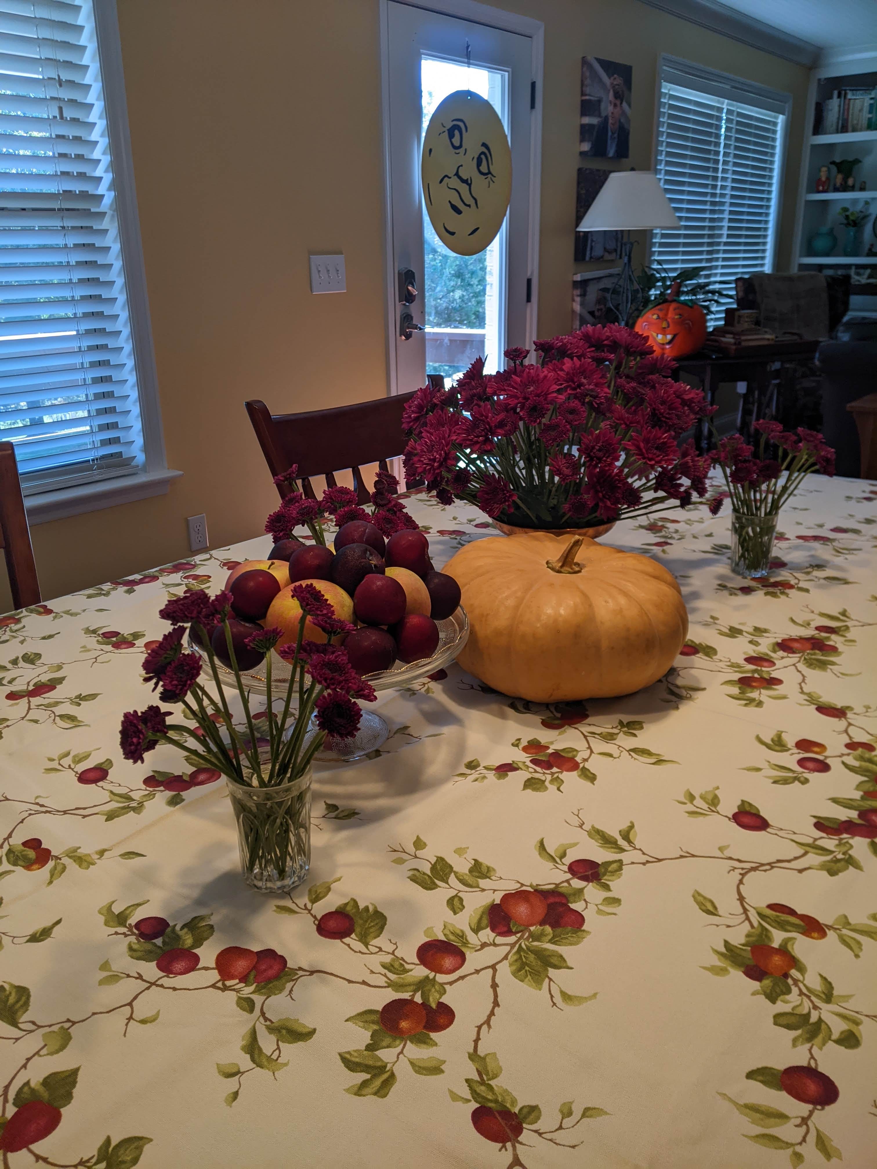 I love this tablecloth for fall events. It has great colors for fall. I paired it with a couple different types of purple mums in a copper footed dish and in little glass vases. I put apples and plums on a cake plate to finish the look.