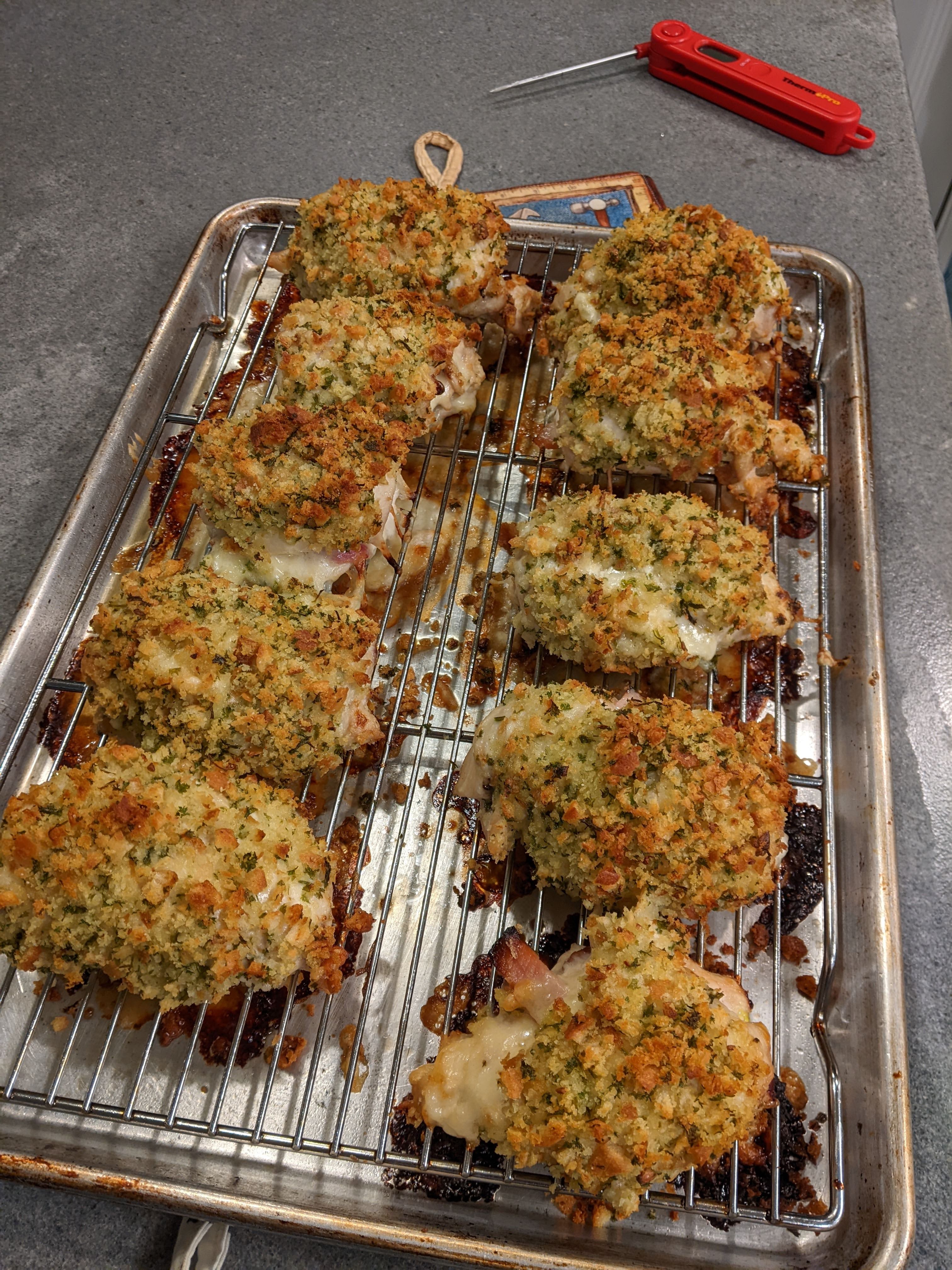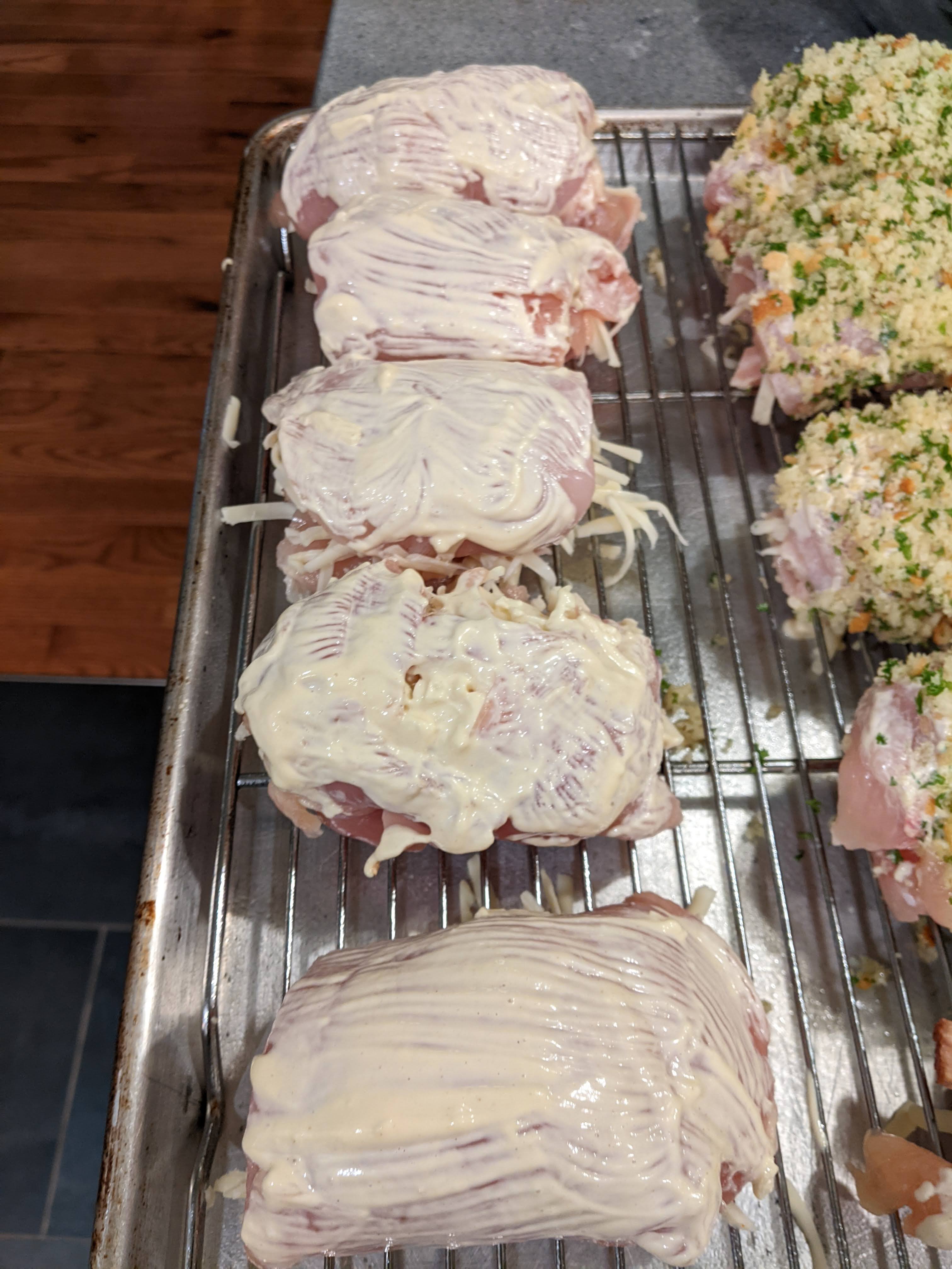 Place the crumbs on a plate and invert the chicken rolls into the crumbs and return to baking sheet.