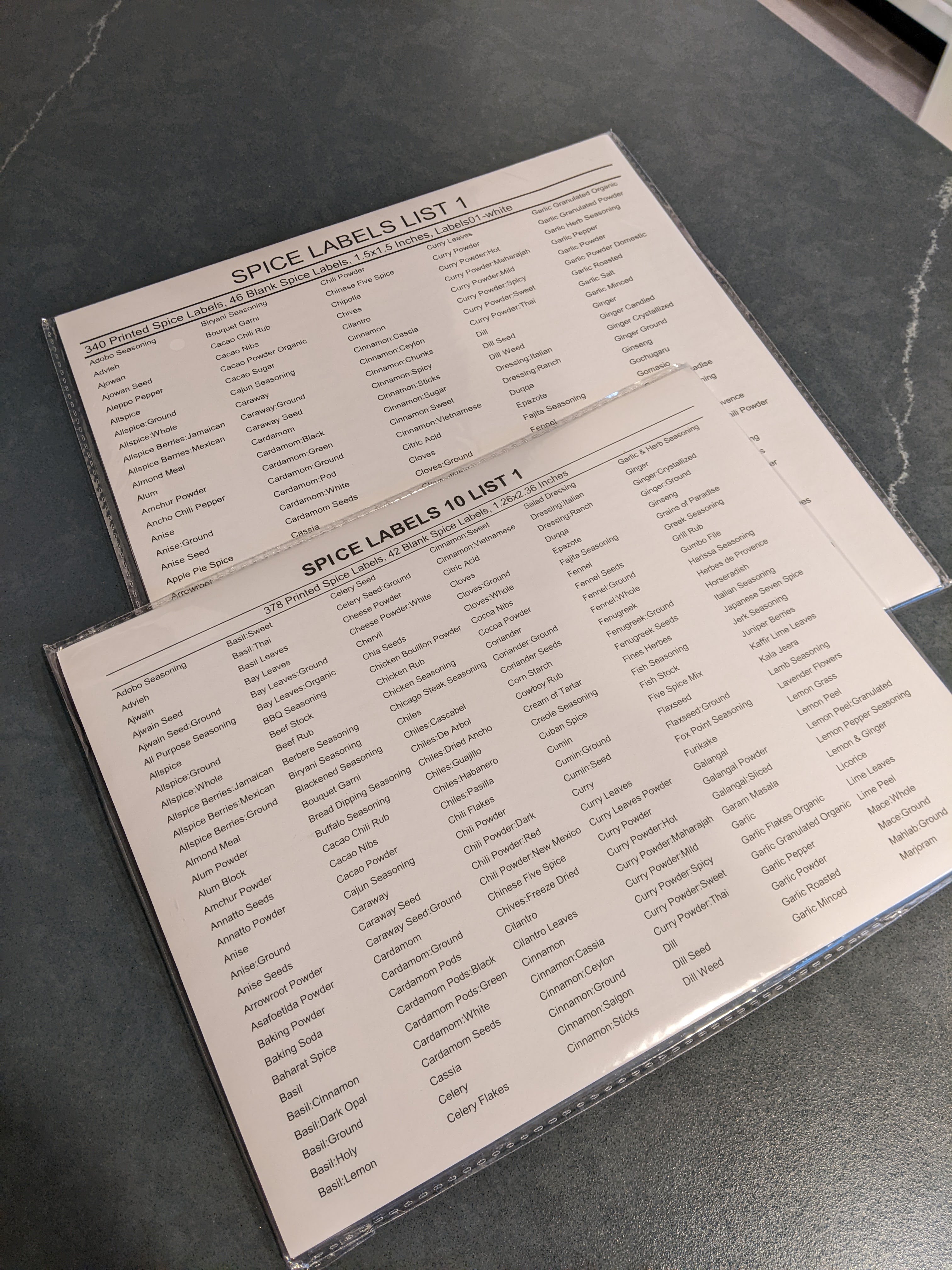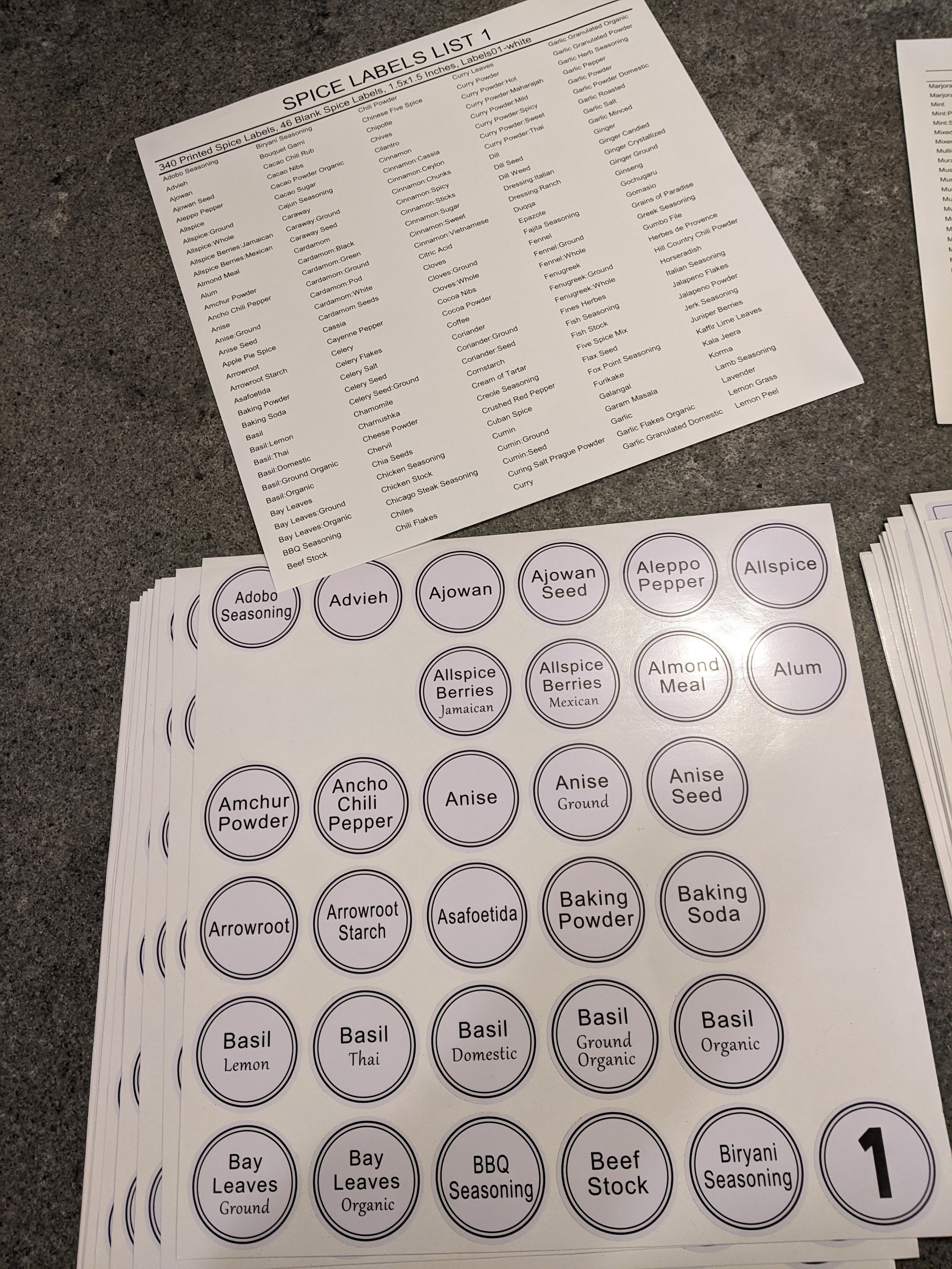 So, I decided to order a bunch of new spice/herb jars with labels from Amazon. I got the box of 48 jars with TONS of labels. It’s clear that they mined Penzey’s Spices for some of the names because the labels include spice blends from there. These labels are really complete, but if you happen to have a spice that isn’t preprinted, there are blank labels. The thing I like most about this set is that it includes round labels for the tops of the jars (although there are discrepancies between the rectangular and round labels). The round labels allow me to easily see what I have on the top shelf of my spice drawer.