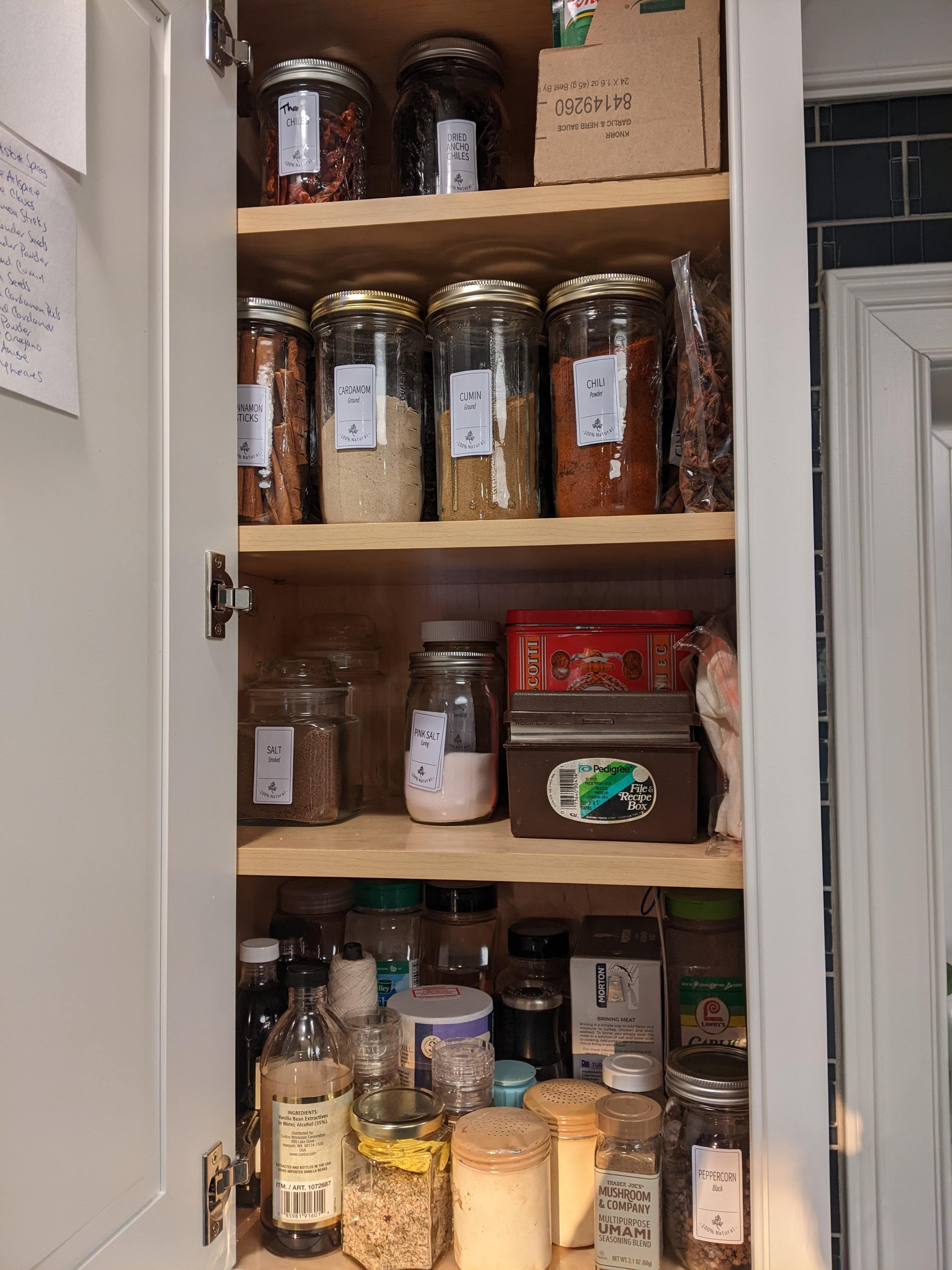 There are some items that I bought in bulk at the Indian grocery and had back stock that I needed to put in jars because storing the bags was cumbersome. I also had bags of a few kinds of dried chiles that had the same problem. Here is how that cabinet looks.
