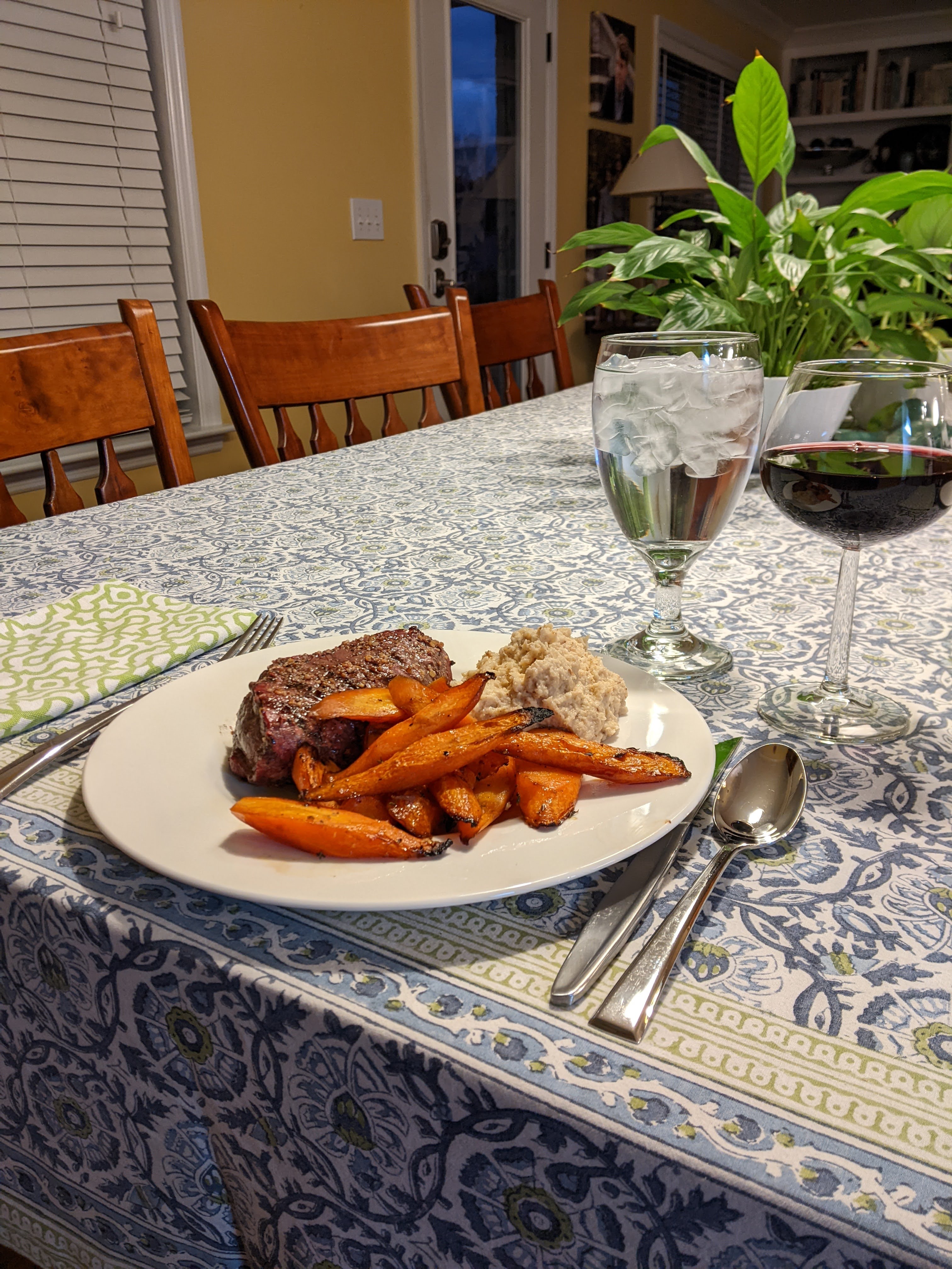 My husband and I have been making a concerted effort to eat more vegetables. We are also trying to eat fewer “white” carbs, so last night I made roasted cauliflower puree, roasted carrots with balsamic glaze and fresh thyme, and grilled sirloin steak. (This plate was for the photo. My husband and I shared this steak, however, I did eat all the vegetables.)