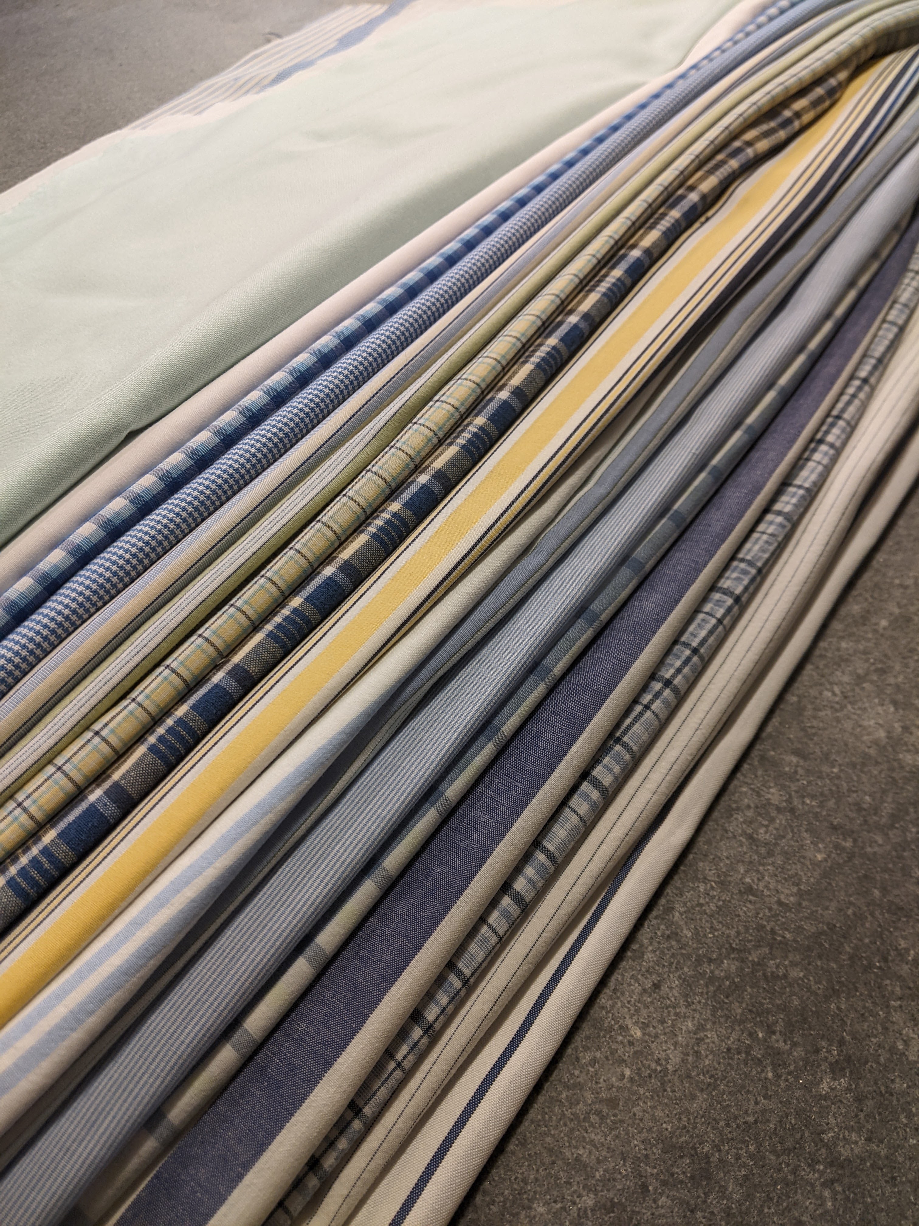 There are a couple shirts, a solid mint green and a blue and white stripe, that aren’t shown here that will be in the finished quilt. The overall color scheme is primarily blue (because blue men’s shirts are easy to find) with greens, yellows, blacks, and whites.