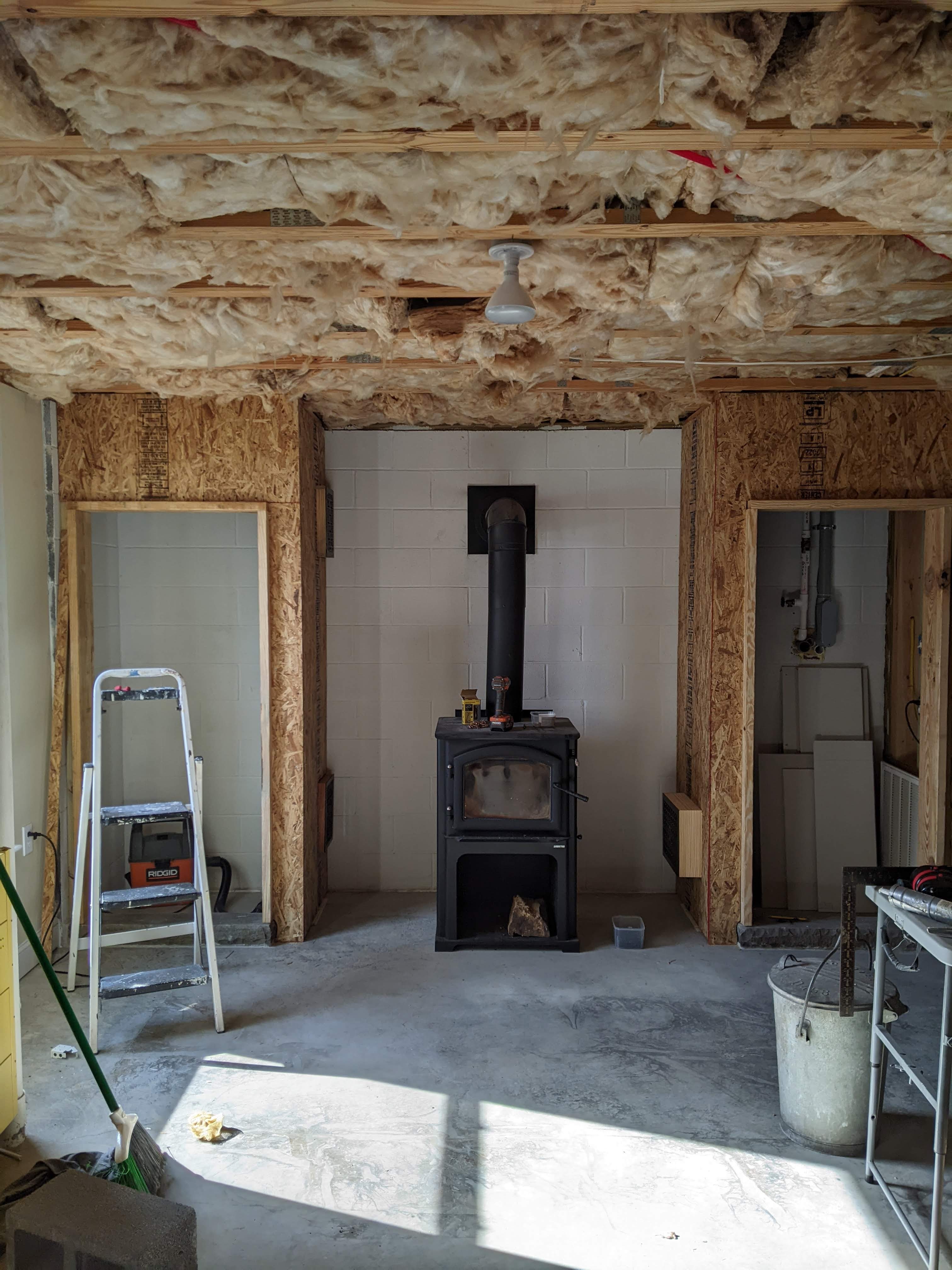 My husband finished the boxes for the grates in the closets by the stove and he cleaned up the grates and sprayed them with lacquer. (He has them dry fitted, but they are not in their final location as far as depth is concerned.) He also finished the electrical work in the closets–lights and outlets. He finally had some time over the weekend to install the OSB. It’s so much easier to see how that space is going to look and feel now that the walls are closed up. We hope to get the OSB finished this week and the cement board installed this weekend.