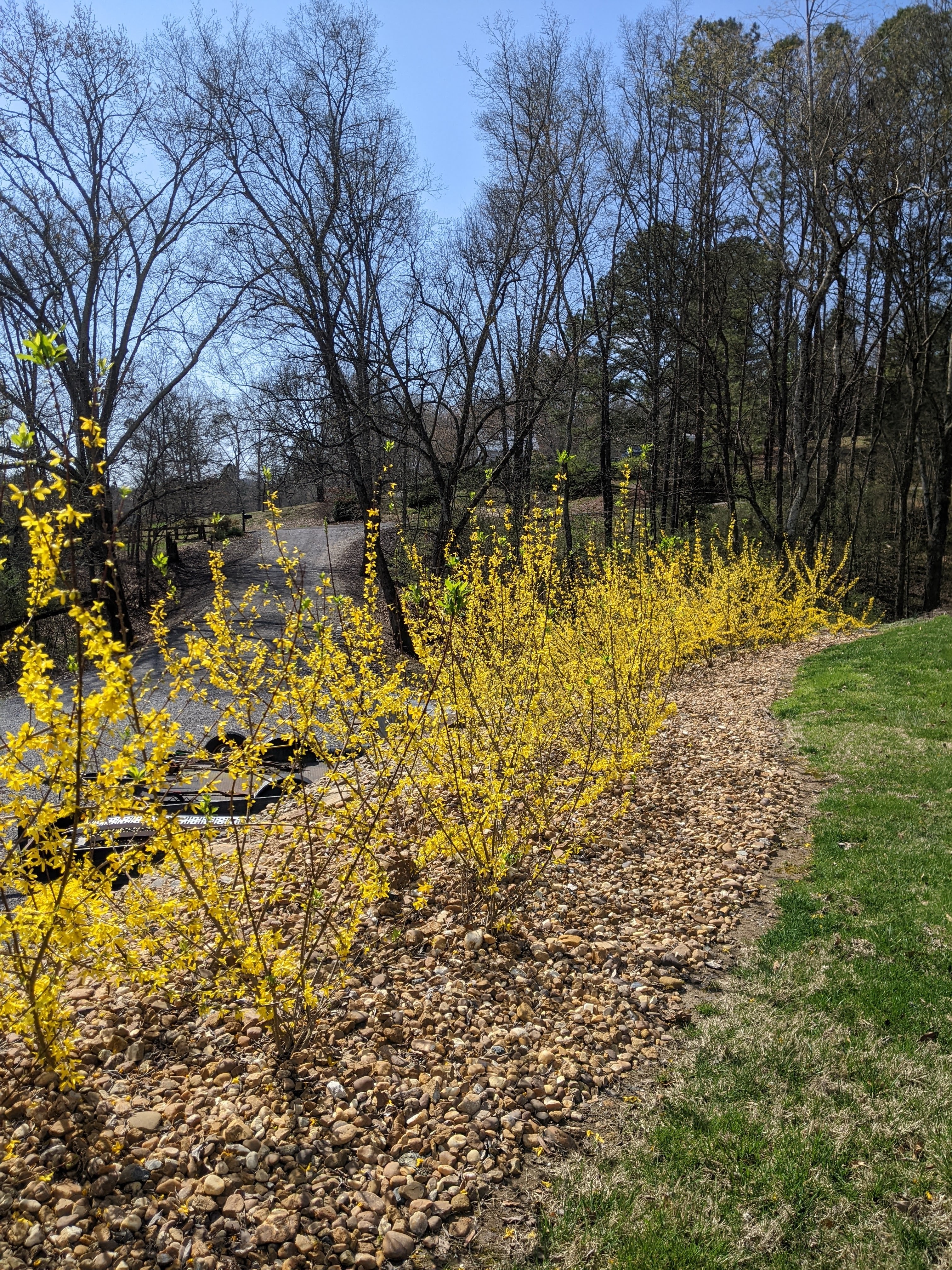 We planted them in two batches. We planted the first 35 bushes in spring of 2021 and then we planted another 65 in October of 2021. The dirt in this particular part of our yard is pretty terrible and rocky, but despite the difficult growing conditions, the forsythia have done really fantastic.