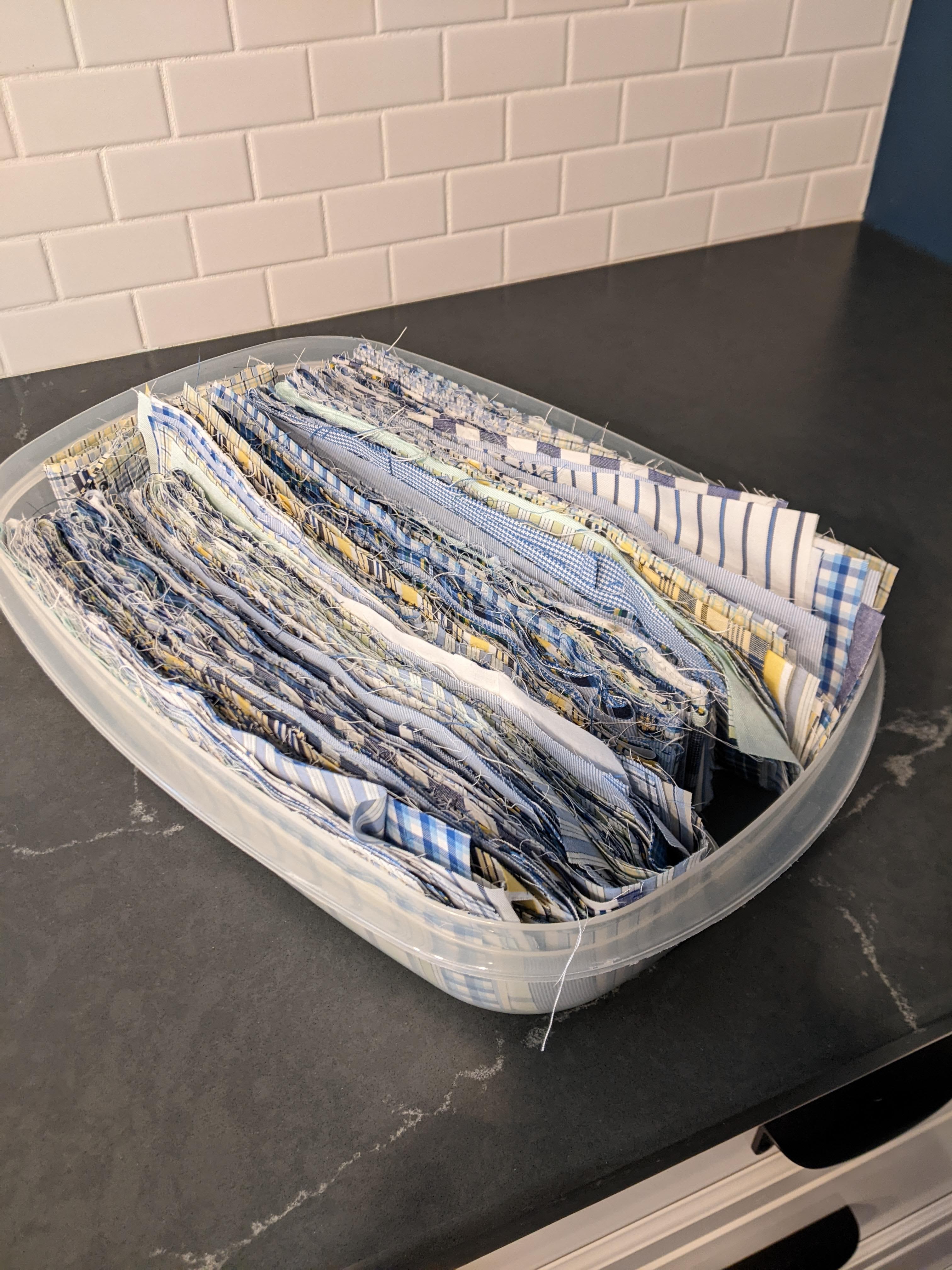 The next step was to make groups of fabrics that we will sew together. I did 20 groups of the three fabrics that I had the most of. Even doing that, there was still more to mix in with the rest of the fabrics. With the other fabrics, I did groups of 6.