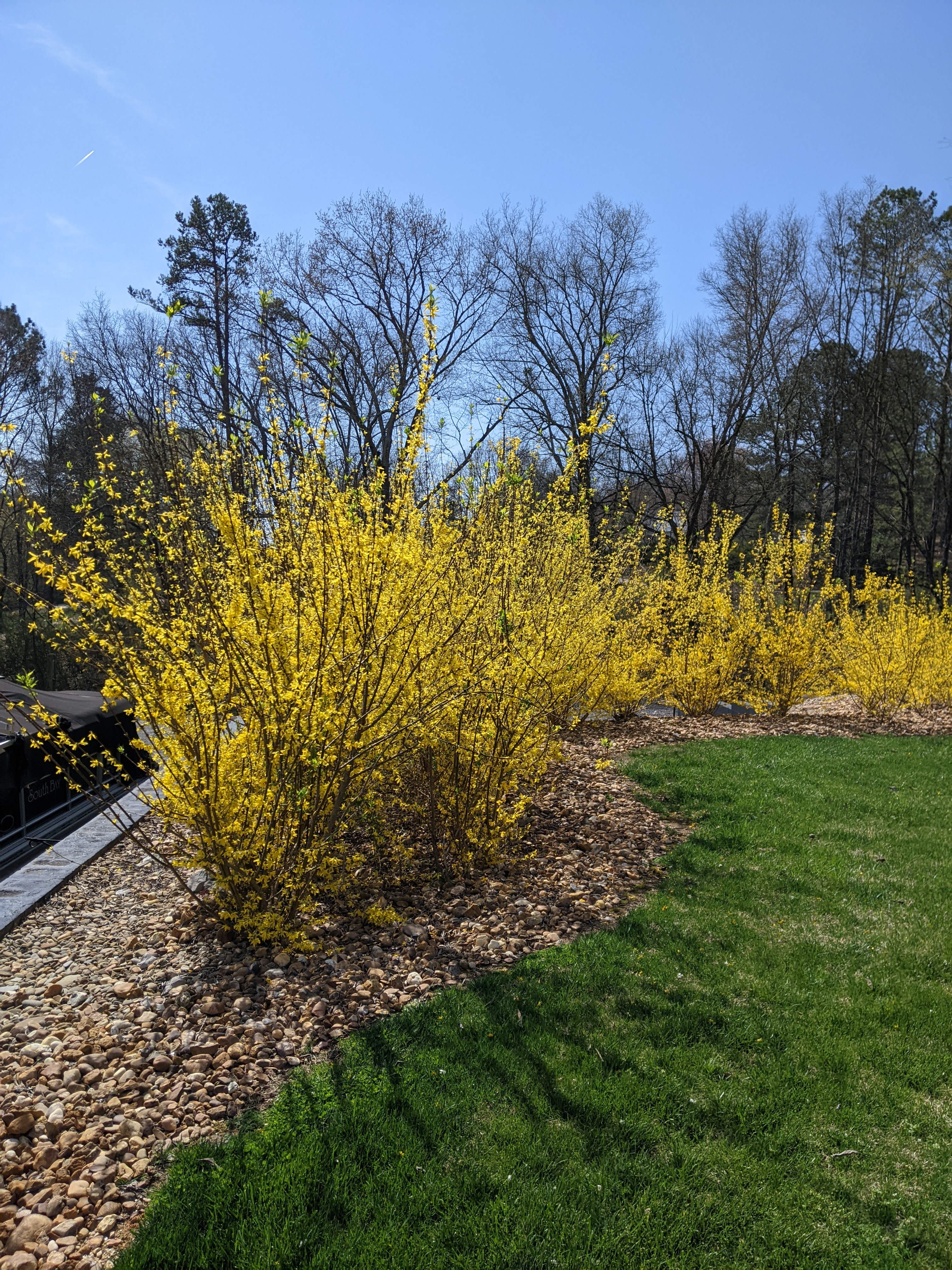 My forsythia were looking pretty gangly after they finished blooming this year, so I gave all of them a really good haircut. 165 zone minutes and 11,000 steps later, I had all 100 of them trimmed back and a wagon and big pile of branches to show for it.